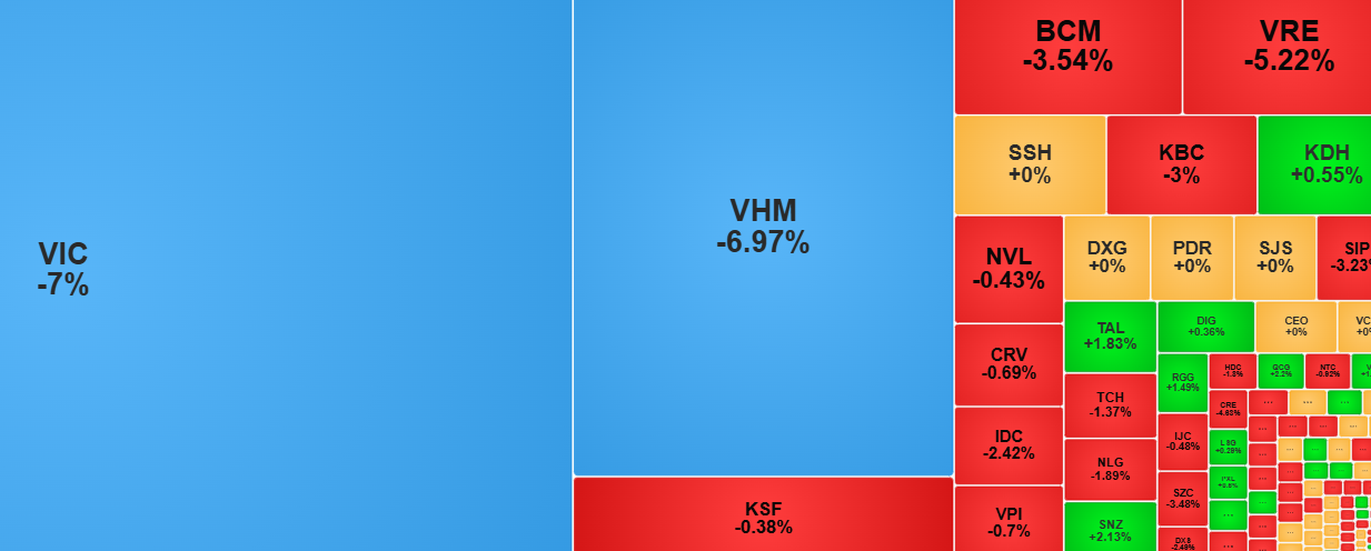 Xét về nhóm ngành, số ngành giảm điểm chiếm ưu thế. Trong đó, với việc VIC và VHM giảm hết biên độ đã khiến nhóm bất động sản giảm nhiều nhất thị trường với 5,46%.
