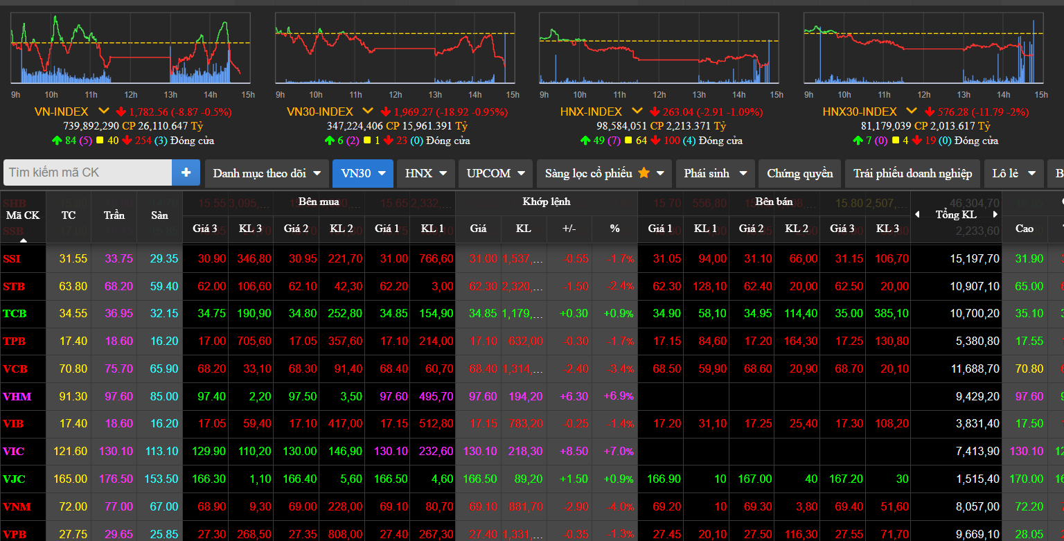 Đóng cửa, VN-Index dừng tại mức 1.782,56 điểm, giảm 8,87 điểm (-0,5%) ; VN30-Index hạ 18,92 điểm (0,95%), còn 1.969,27 điểm.