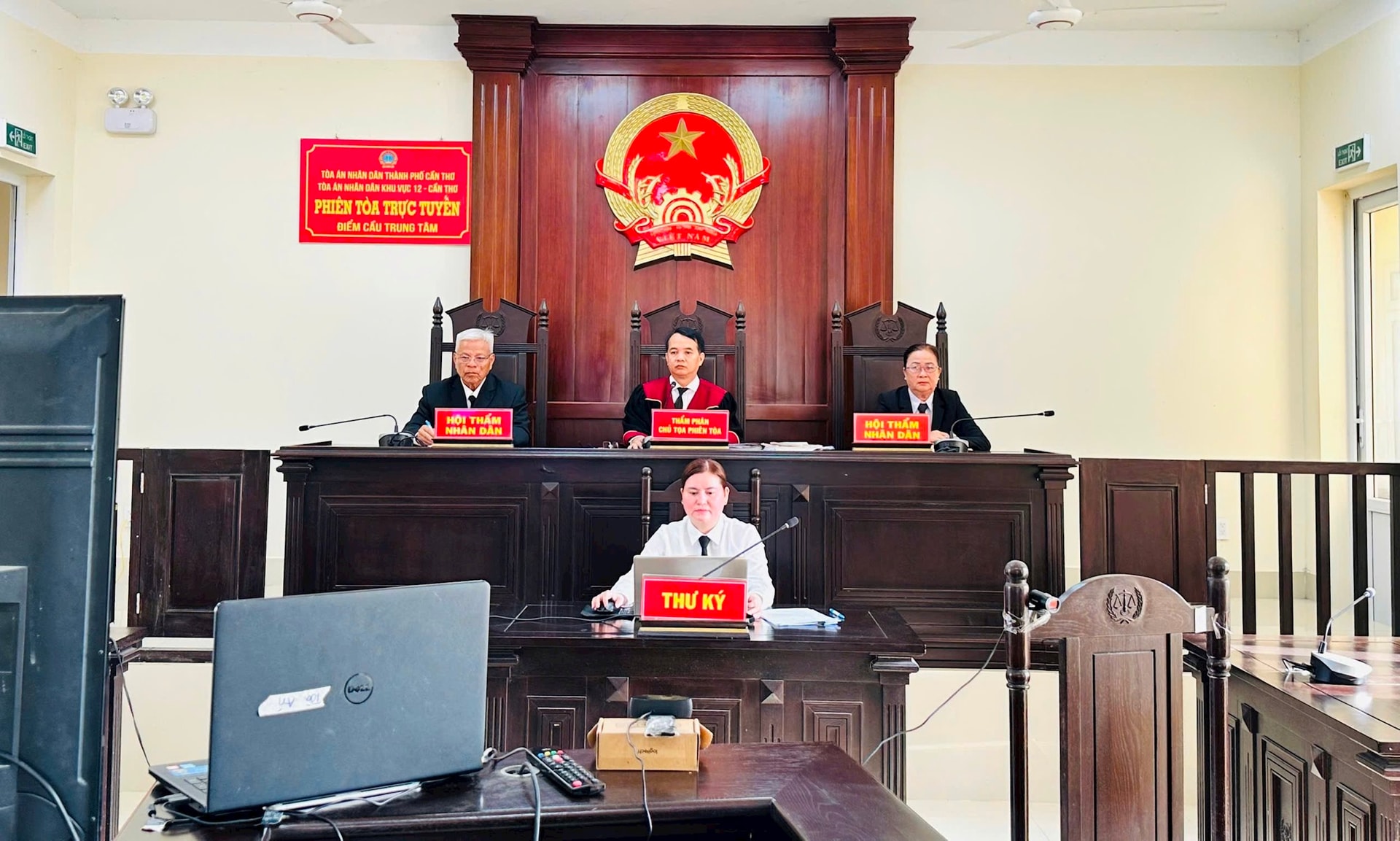Phiên tòa được kết nối từ điểm cầu trung tâm tại TAND khu vực 12 – Cần Thơ đến điểm cầu thành phần tại TAND khu vực 10 – An Giang, bảo đảm đúng quy định pháp luật.