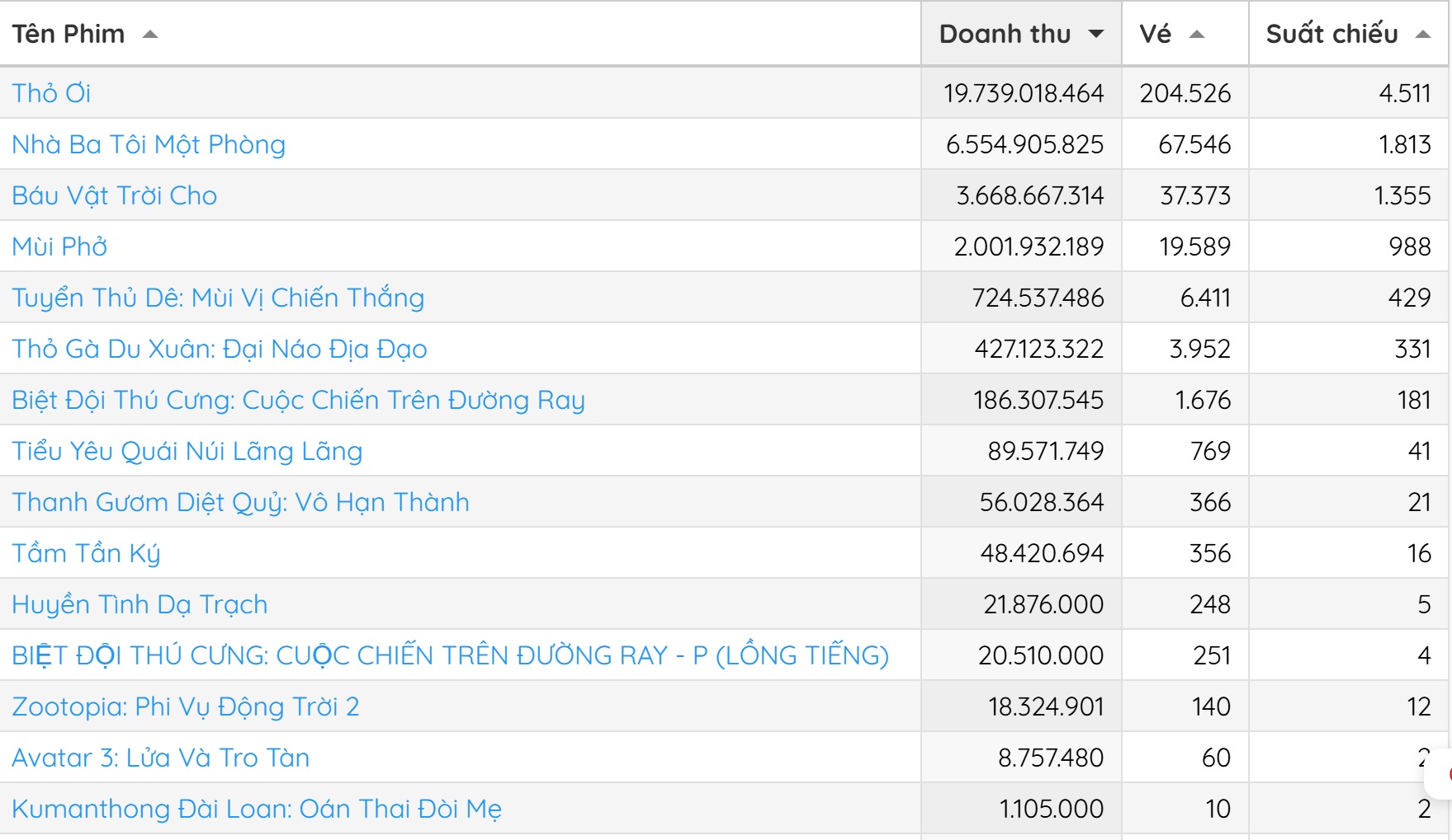 Tổng doanh thu của Thỏ ơi!! tính đến sáng 20-2 (tức mùng 4 Tết). Nguồn: Box Office Vietnam