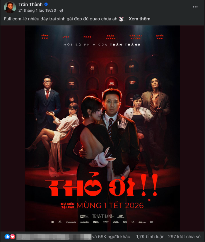 Việc các bài đăng liên quan đến Thỏ Ơi! liên tục đạt lượng tương tác cao, từ lượt thích, bình luận cho đến chia sẻ, cho thấy bộ phim đang tạo ra hiệu ứng lan tỏa trên mạng xã hội. Mặc dù chưa ra rạp chính thức nhưng dự án phim Tết 2026 của Trấn Thành vẫn thu hút sự chú ý nhờ dàn diễn viên đa dạng và sức ảnh hưởng sẵn có của các nhân vật tham gia.