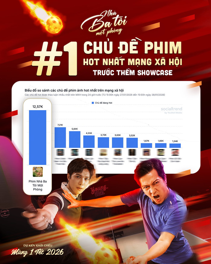 Mới đây, fanpage chính thức của phim Nhà Ba Tôi Một Phòng đã chia sẻ thông tin bộ phim đang giữ vị trí top 1 chủ đề phim hot nhất mạng xã hội trong 24 giờ, với 12,57 nghìn lượt thảo luận. Dữ liệu này nhanh chóng thu hút sự chú ý, đặc biệt trong bối cảnh mùa phim Tết đang bước vào giai đoạn cạnh tranh.