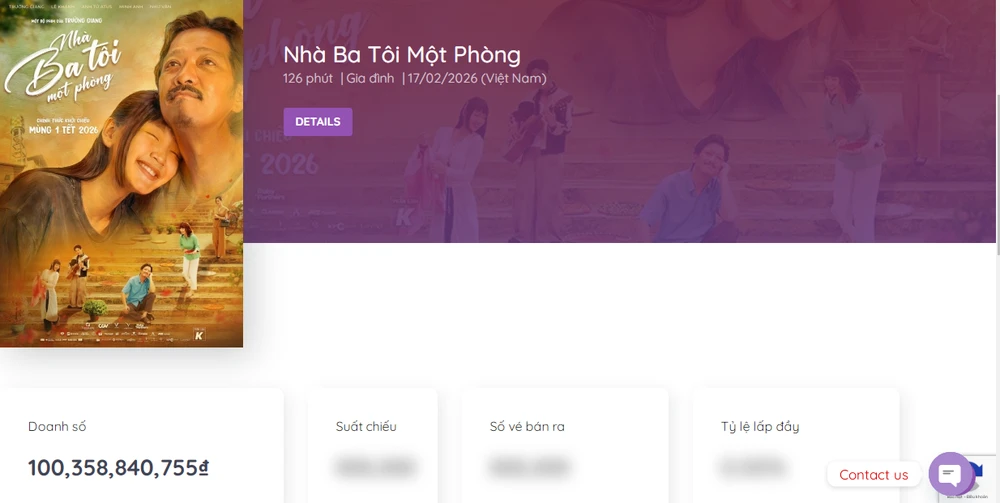 Theo thống kê của Box Office Vietnam, tính đến 19 giờ 20 phút ngày 27-2, phim điện ảnh Nhà ba tôi một phòng chính thức vượt mốc 100 tỉ đồng sau gần 11 ngày ra rạp.