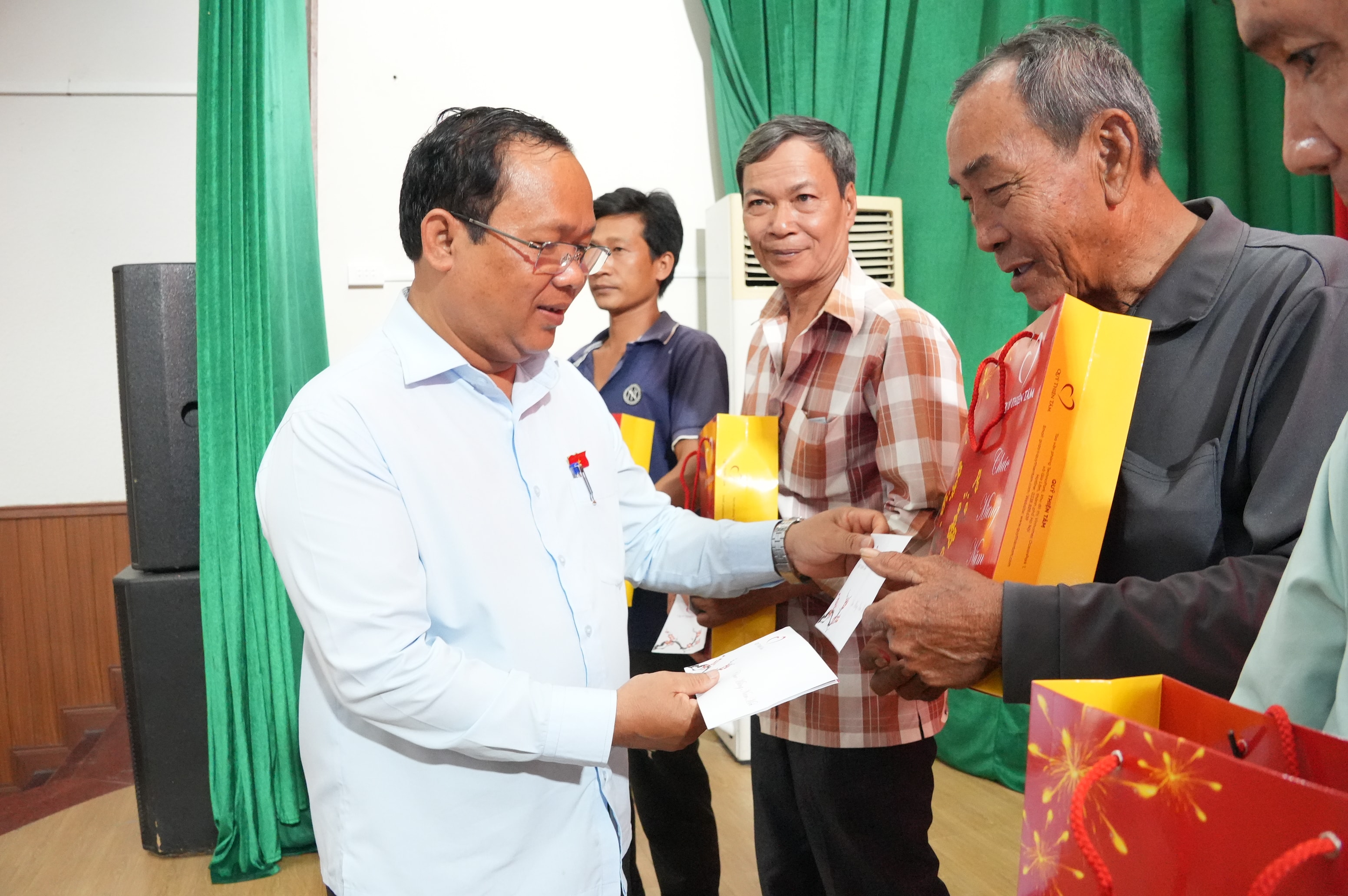 Ông Thổ Út, Phó Giám đốc Sở Dân tộc và Tôn giáo tỉnh Đồng Nai trao quà tặng các gia đình chính sách khó khăn, hộ nghèo. Ảnh: Thạc Hiếu