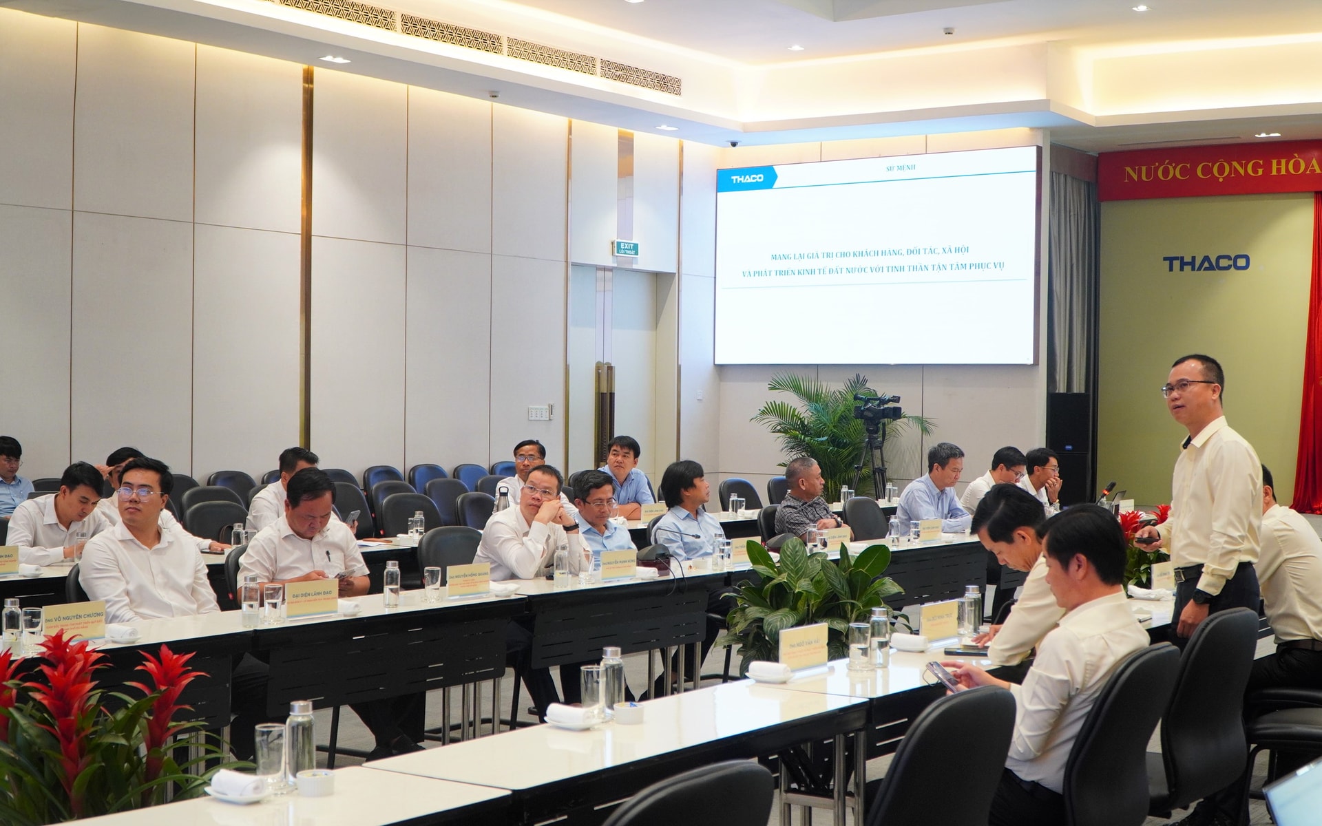 Đại diện THACO báo cáo đoàn công tác tình hình sản xuất, kinh doanh cùng những định hướng phát triển thời gian tới.