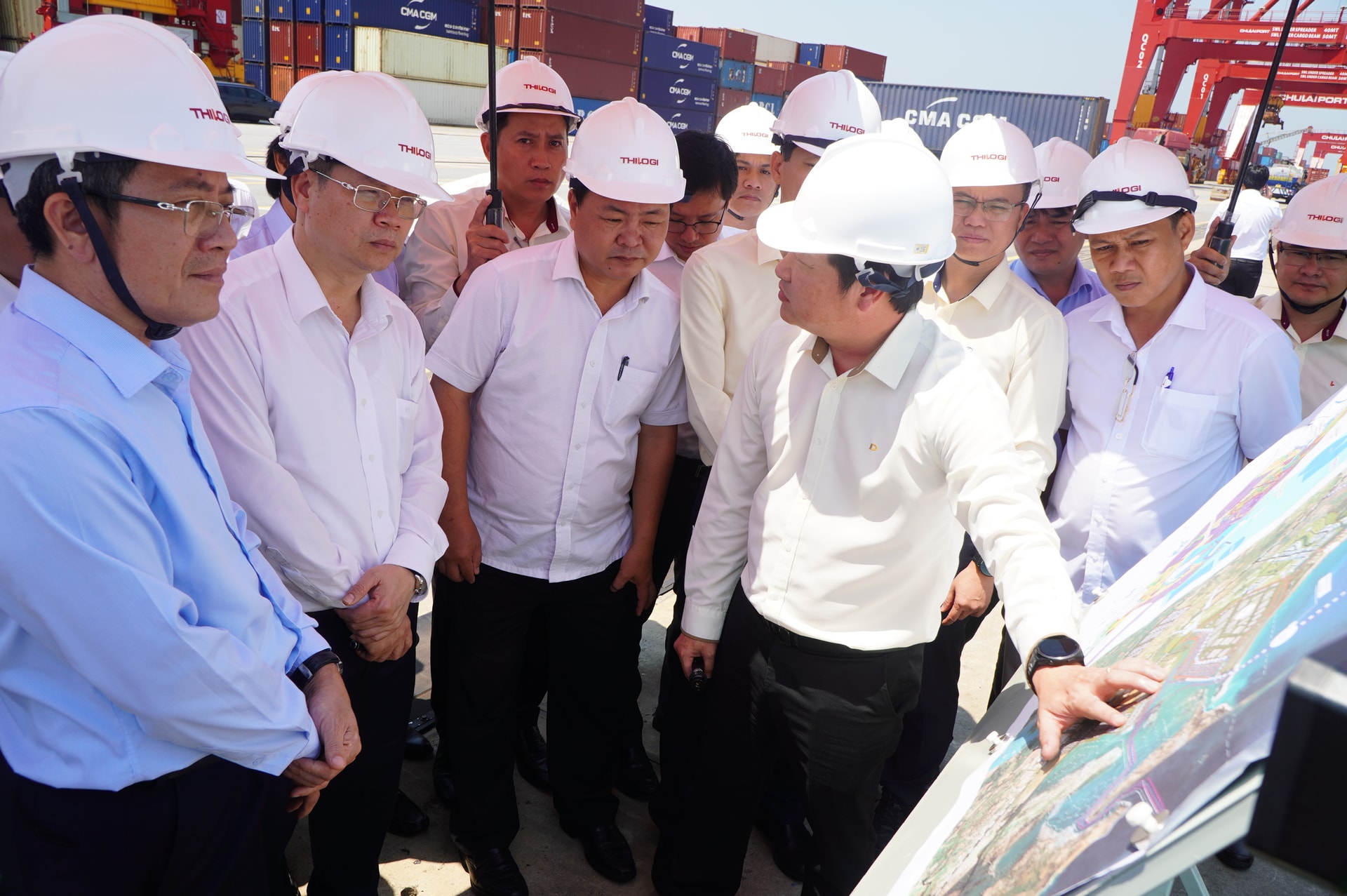 Phó Bí thư Thành ủy Nguyễn Mạnh Hùng (thứ 2, bên trái sang) nghe THACO báo cáo định hướng xây dựng Cảng quốc tế Chu Lai. Ảnh: VINH ANH