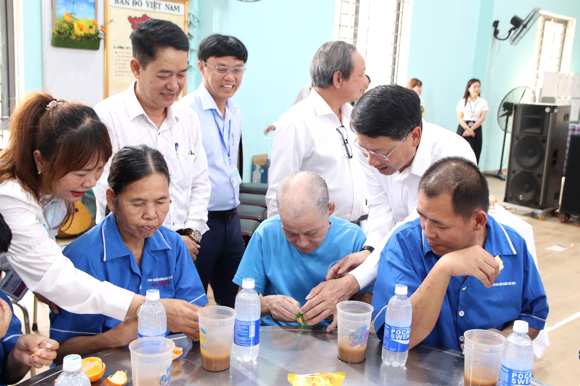 Phó Bí thư Thành ủy Ngô Xuân Thắng ân cần thăm hỏi, động viên bệnh nhân đang điều dưỡng, chăm sóc tại Trung tâm Điều dưỡng người tâm thần Đà Nẵng. Ảnh: TRỌNG HUY