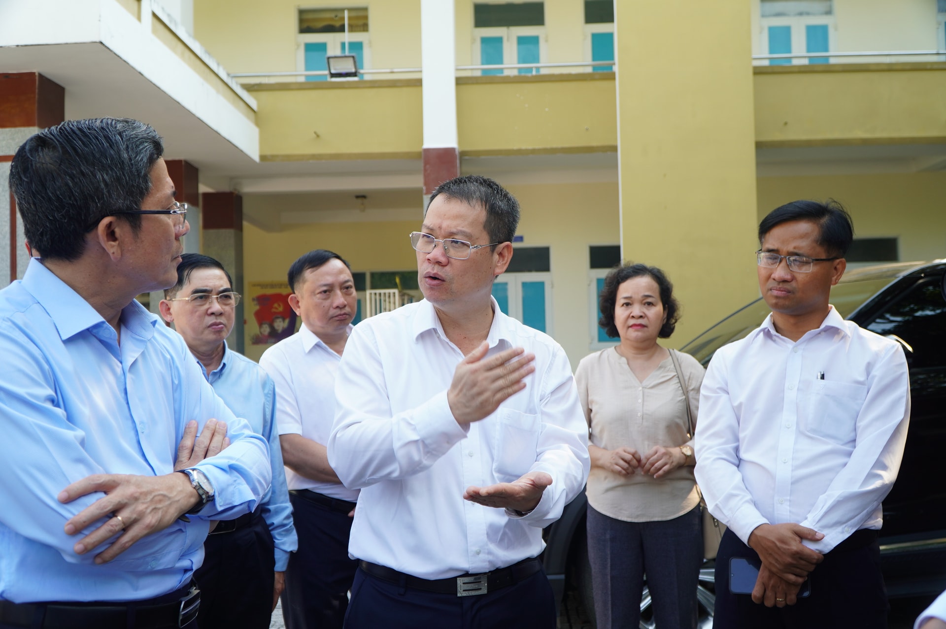 Đoàn công tác nghe lãnh đạo Trường THCS Nguyễn Du báo cáo phương án sử dụng trụ sở Hội Văn học - Nghệ thuật tỉnh Quảng Nam (cũ), dự kiến sẽ bàn giao cho trường sử dụng. Ảnh: VINH ANH