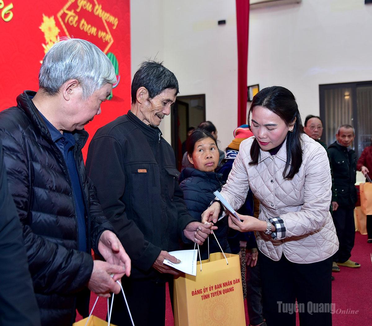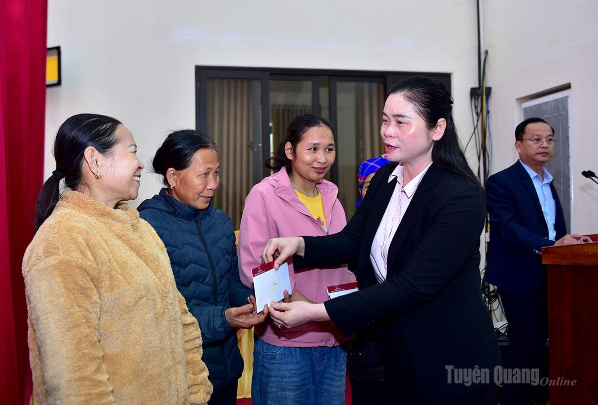 Đồng chí Phó Bí thư Thường trực chuyên trách Đảng ủy UBND tỉnh Nông Thị Bích Huệ tặng quà Tết các hộ chính sách, hộ nghèo, hộ có hoàn cảnh khó khăn trên địa bàn xã Hàm Yên.