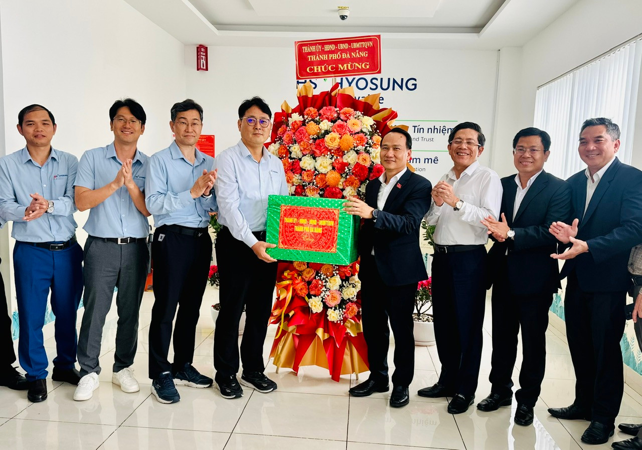 Phó Bí thư Thường trực Thành ủy Nguyễn Đình Vĩnh (thứ 4, bên phải sang) tặng quà Công ty TNHH HS Hyosung Quảng Nam. ẢNH: XUÂN HIẾU