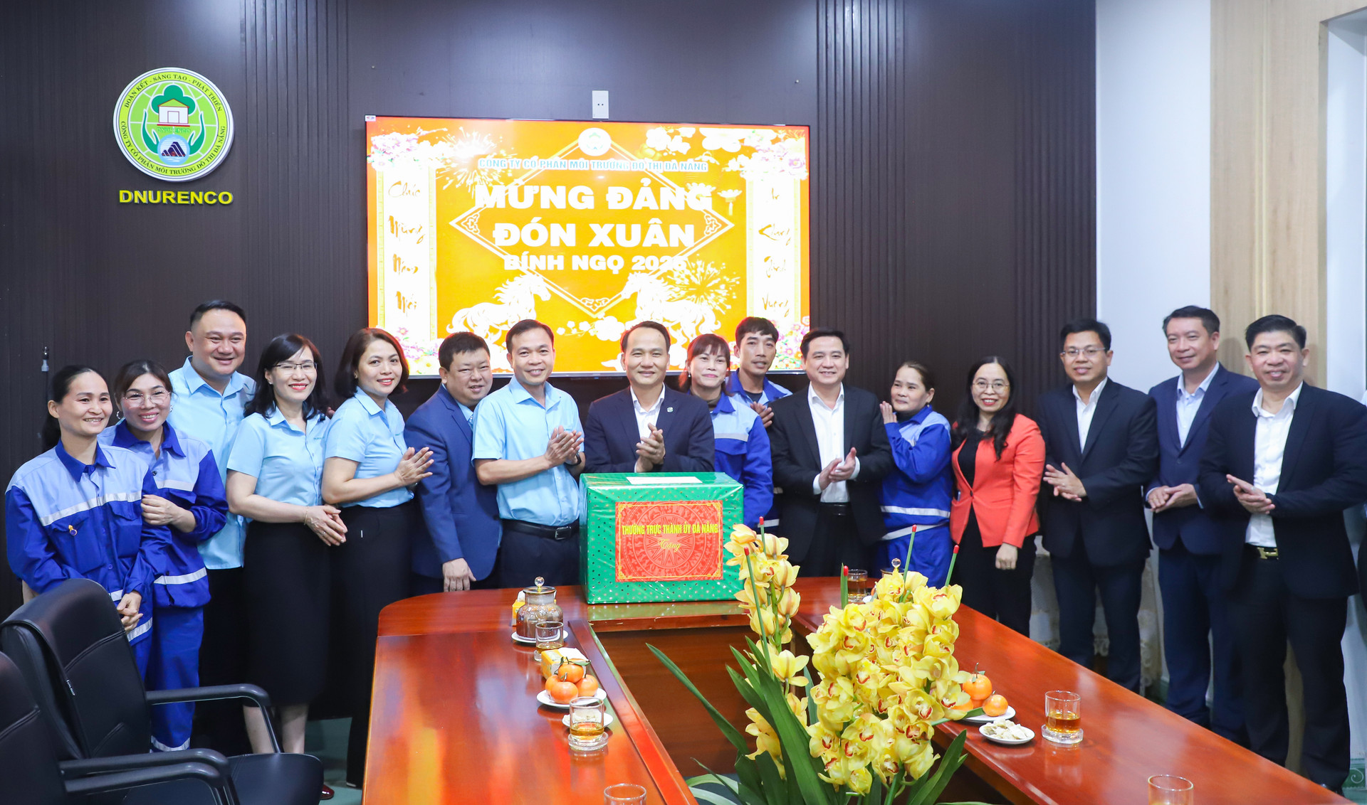 Phó Bí thư Thường trực Thành ủy Nguyễn Đình Vĩnh (thứ 9, bên phải sang) tặng quà chúc Tết cán bộ, công nhân viên Công ty Cổ phần Môi trường đô thị Đà Nẵng. Ảnh: NGỌC PHÚ