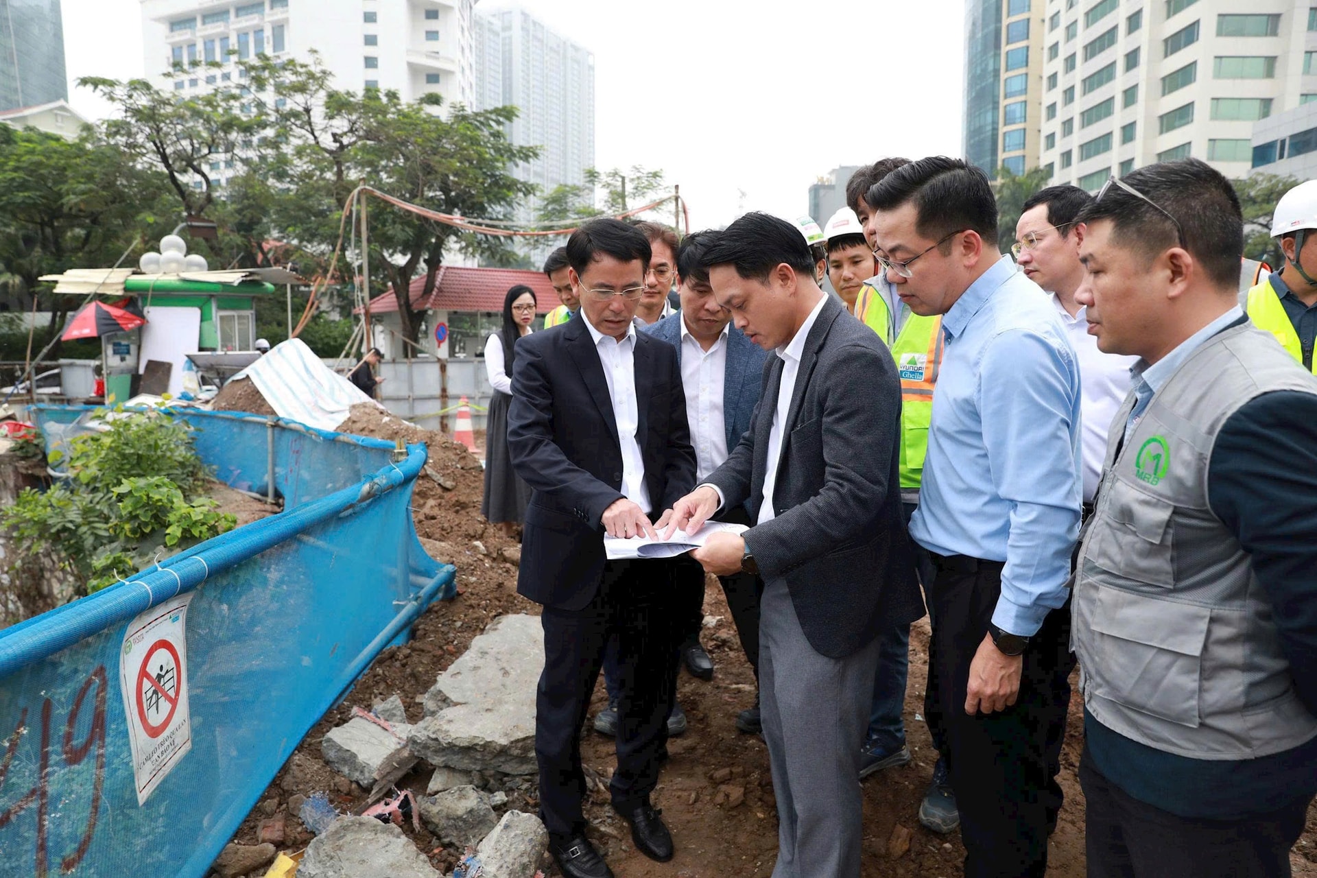 Phó Bí thư Thường trực Thành ủy Hà Nội Nguyễn Trọng Đông kiểm tra thực địa tại dự án nhà ga Metro đoạn Kim Mã - Ga Hà Nội - Trần Hưng Đạo trên địa bàn phường Giảng Võ. Ảnh: Viết Thành