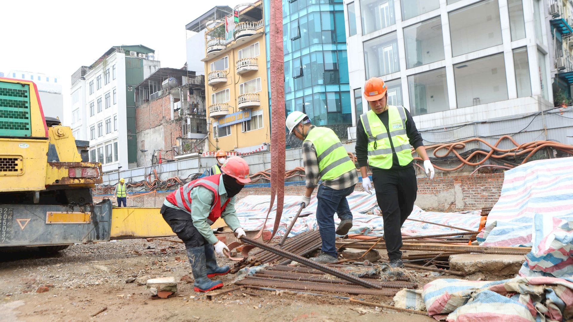 Không khí thi công khẩn trương trên công trường tại dự án nhà ga Metro đoạn Kim Mã - Ga Hà Nội - Trần Hưng Đạo. Ảnh: Viết Thành