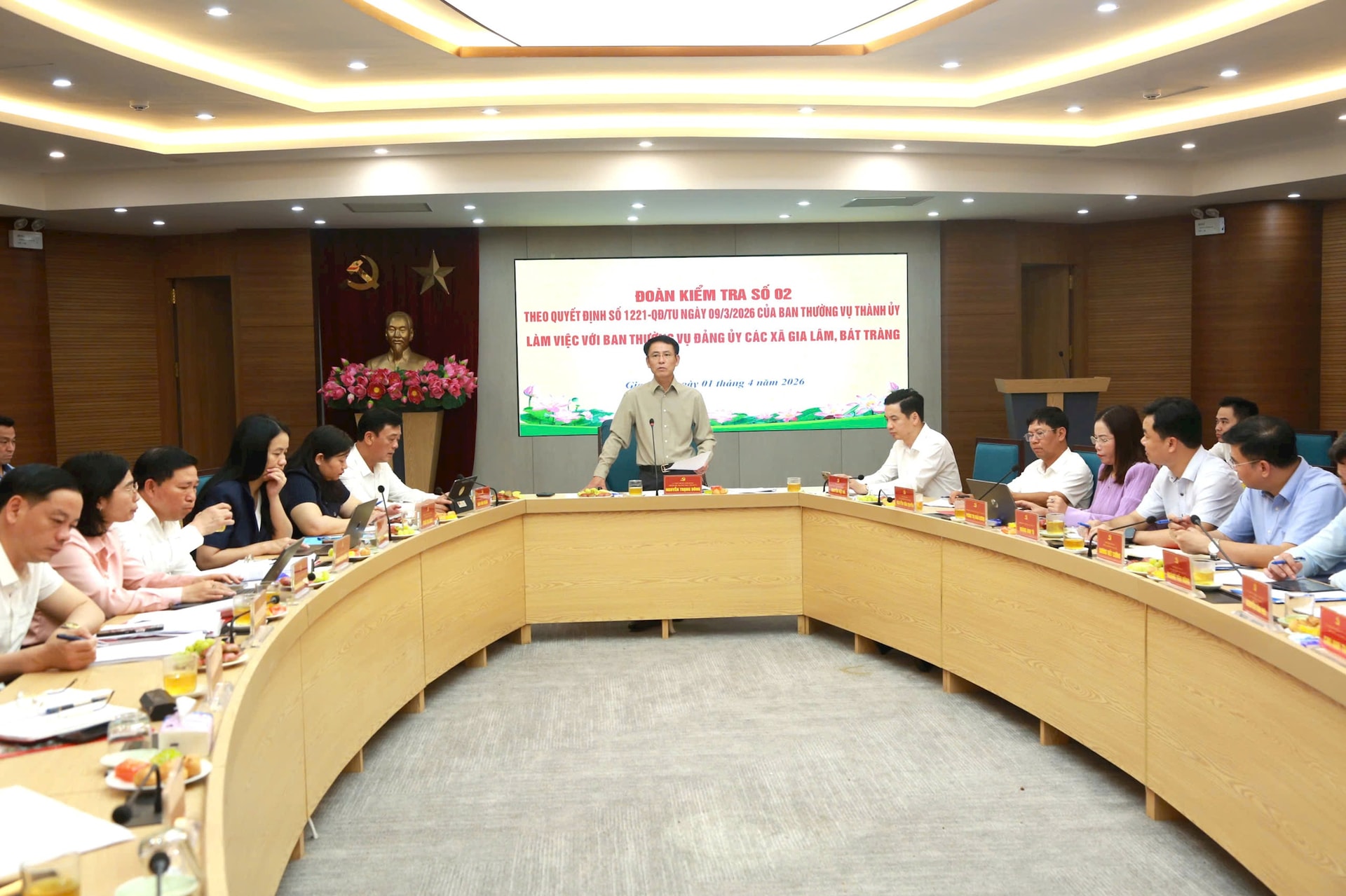 Buổi làm việc nhằm công bố kết quả kiểm tra đối với người đứng đầu cấp ủy tại xã Gia Lâm và xã Bát Tràng trong công tác lãnh đạo, chỉ đạo tổ chức nghiên cứu, quán triệt, học tập và triển khai thực hiện Nghị quyết Đại hội lần thứ XIV của Đảng, Nghị quyết Đại hội lần thứ XVIII Đảng bộ thành phố Hà Nội, cùng việc xây dựng, thực hiện quy chế làm việc, chương trình, kế hoạch tổ chức thực hiện nghị quyết đại hội các cấp; xây dựng Đảng bộ và hệ thống chính trị trong sạch, vững mạnh, nêu gương, hành động, trách nhiệm.