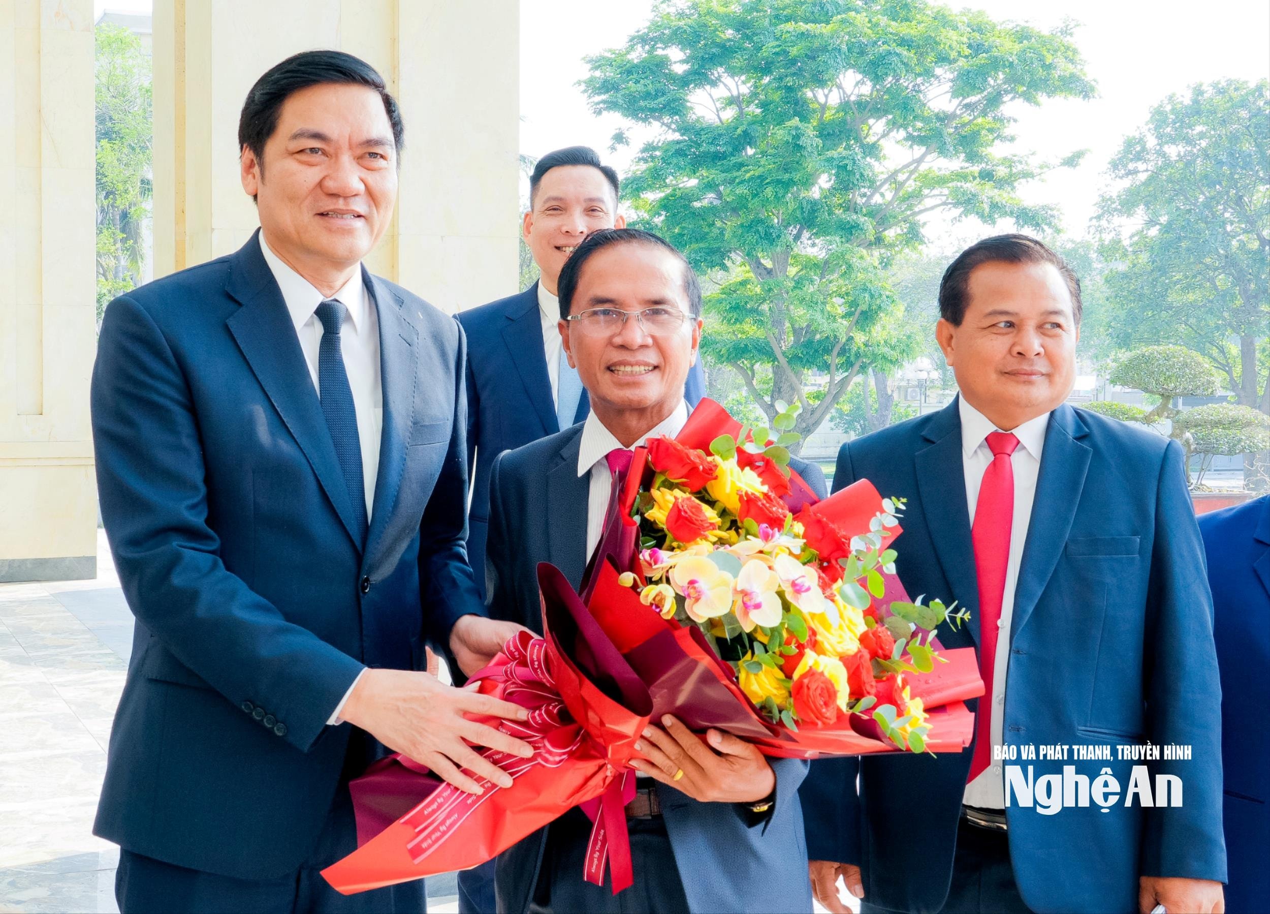Phó Bí thư Thường trực Tỉnh ủy, Chủ tịch HĐND tỉnh Hoàng Nghĩa Hiếu tặng hoa chào mừng Chủ tịch HĐND tỉnh Sa La Van và đoàn sang thăm, làm việc tại Nghệ An. Ảnh: Phạm Bằng