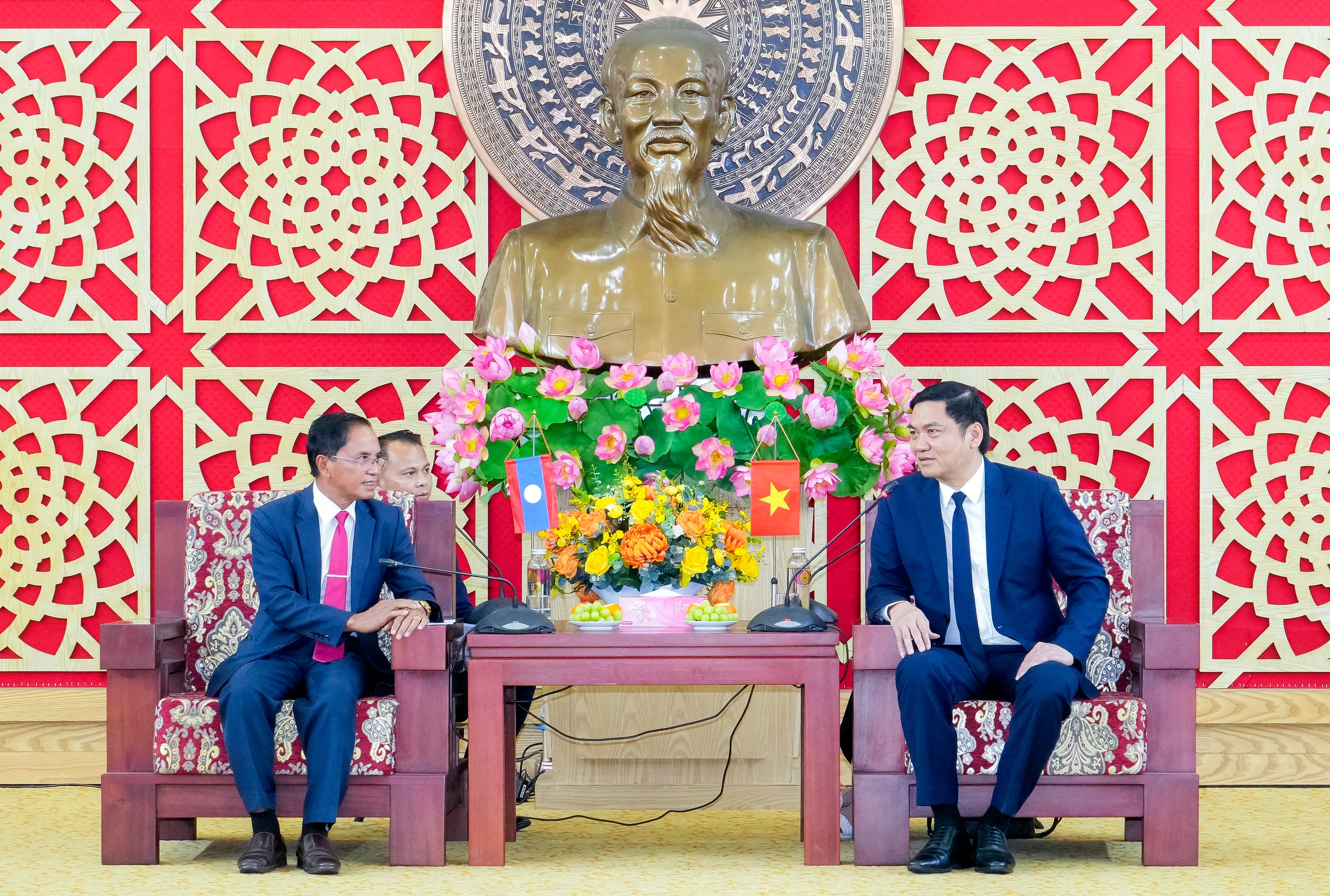 Phó Bí thư Thường trực Tỉnh ủy, Chủ tịch HĐND tỉnh Hoàng Nghĩa Hiếu tiếp đoàn đại biểu HĐND tỉnh Sa La Van (Lào) do đồng chí Si Hêng Hóm Sổm Băt - Chủ tịch HĐND tỉnh Sa La Van sang thăm, làm việc tại Nghệ An. Ảnh: Phạm Bằng