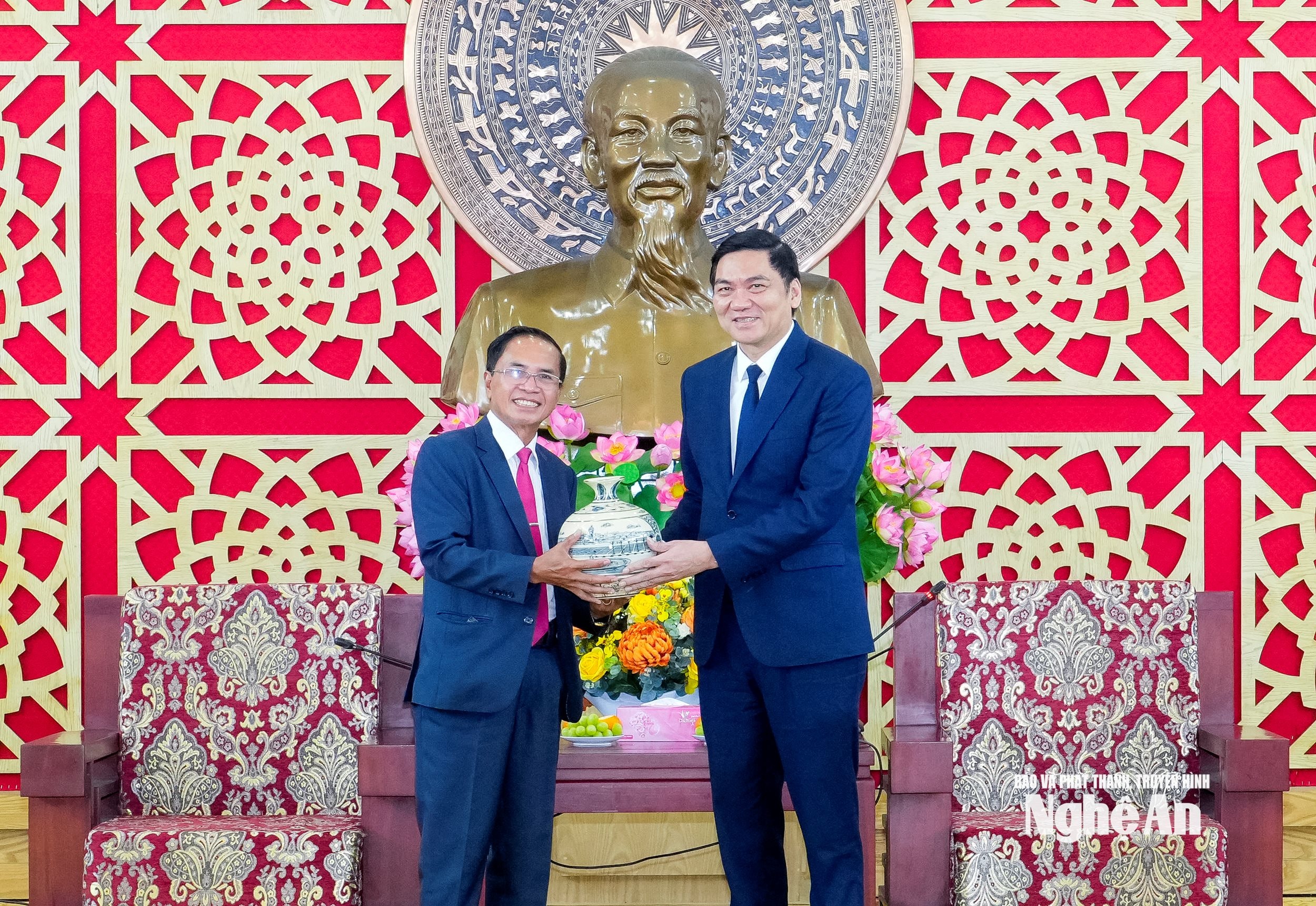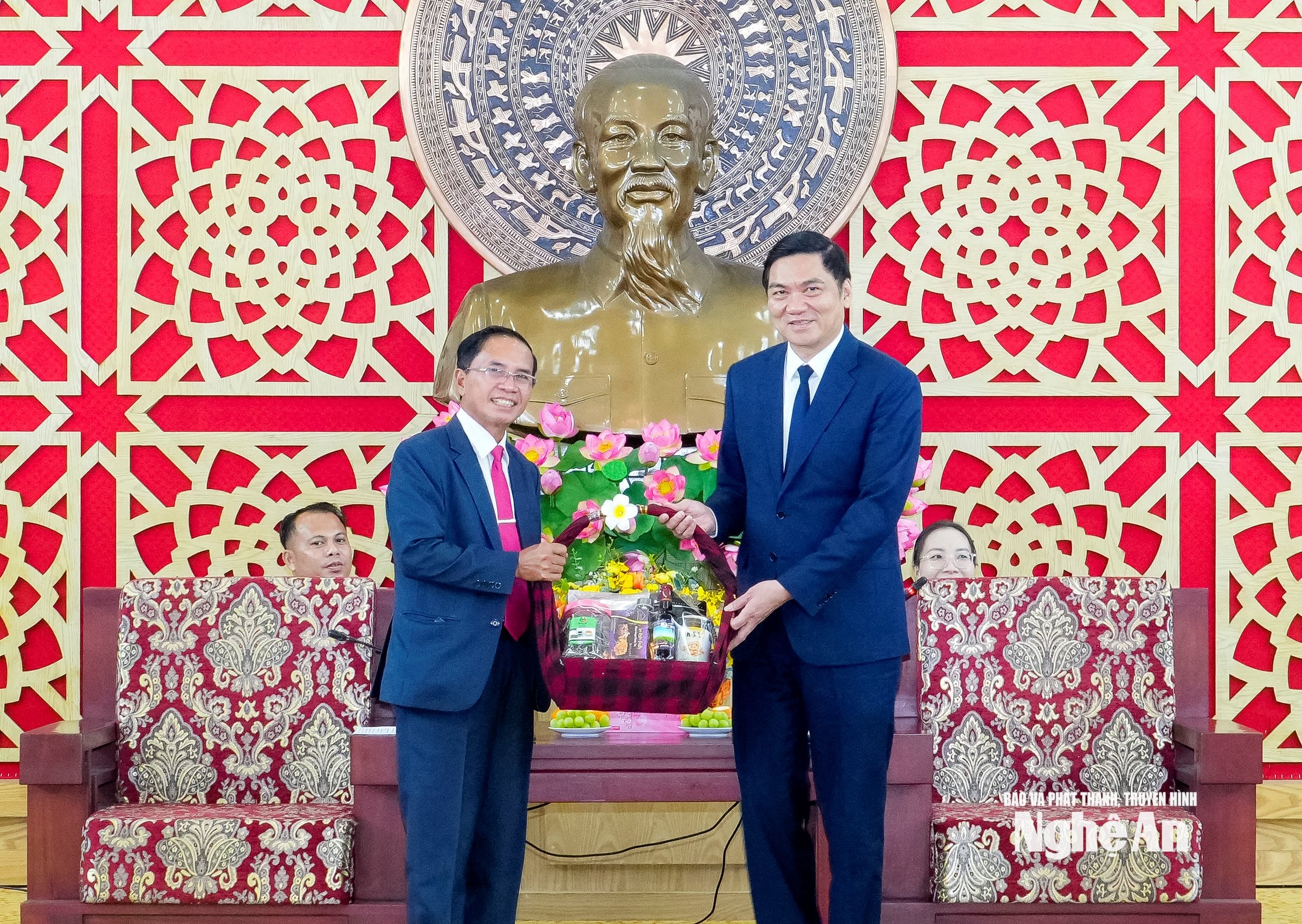 Thay mặt Đảng bộ, chính quyền và Nhân dân tỉnh Sa La Van, Chủ tịch HĐND tỉnh Si Hêng Hóm Sổm Băt bày tỏ vui mừng khi đến thăm và làm việc tại tỉnh Nghệ An; chúc mừng thành công cuộc bầu cử đại biểu Quốc hội khóa XVI và đại biểu HĐND các cấp, nhiệm kỳ 2026-2031 trên địa bàn tỉnh Nghệ An.