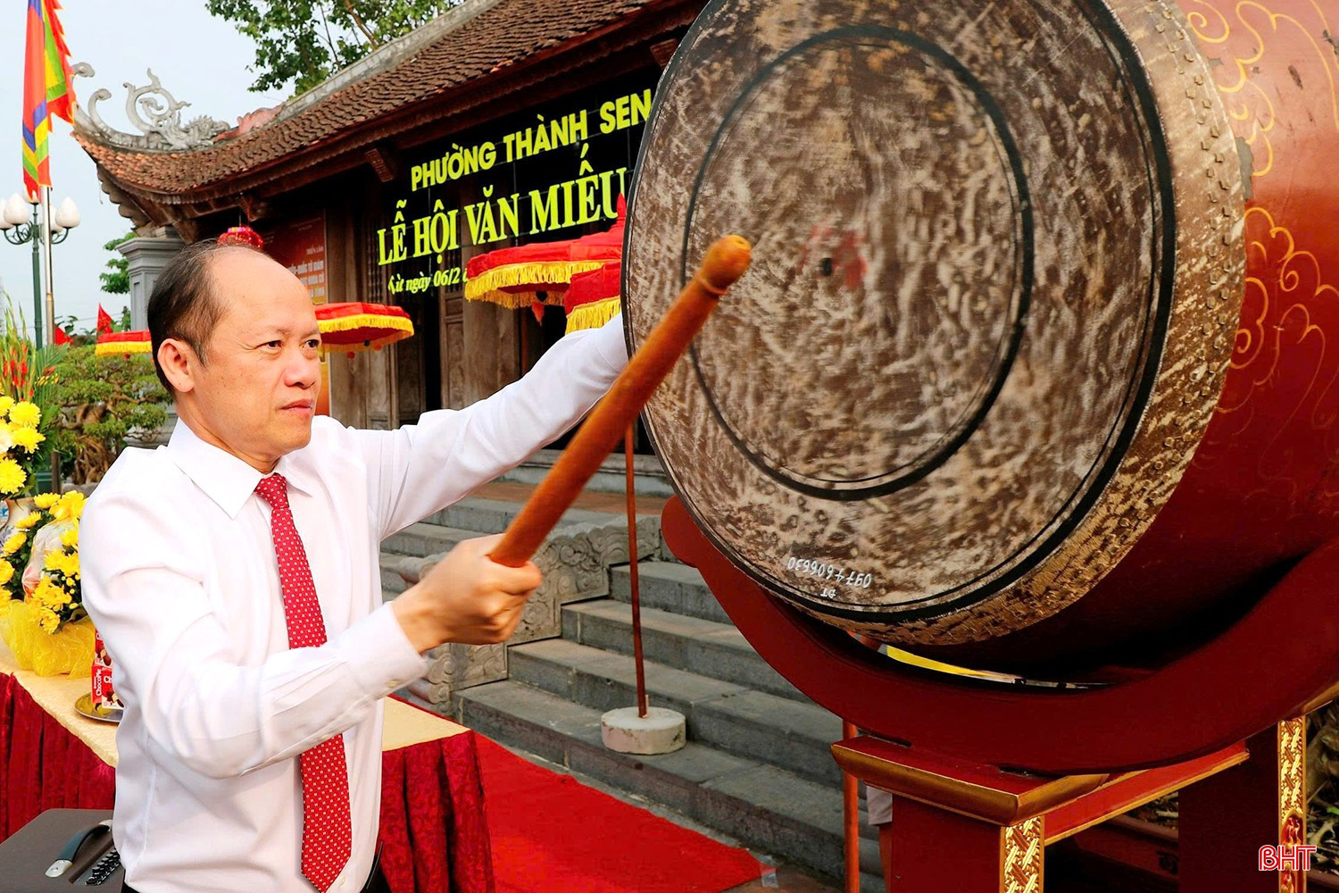 Các đồng chí: Nguyễn Hồng Lĩnh - Phó Bí thư Thường trực Tỉnh ủy, Chủ tịch HĐND tỉnh; Trần Quang Tuấn - Bí thư Đảng ủy, Chủ tịch HĐND phường Thành Sen; Thiếu tướng, GS.TS Hồ Trọng Ngũ - Viện Trưởng Viện nghiên cứu bảo tồn di sản văn hóa Việt Nam và lãnh đạo các sở, ngành, địa phương cùng dự lễ.
