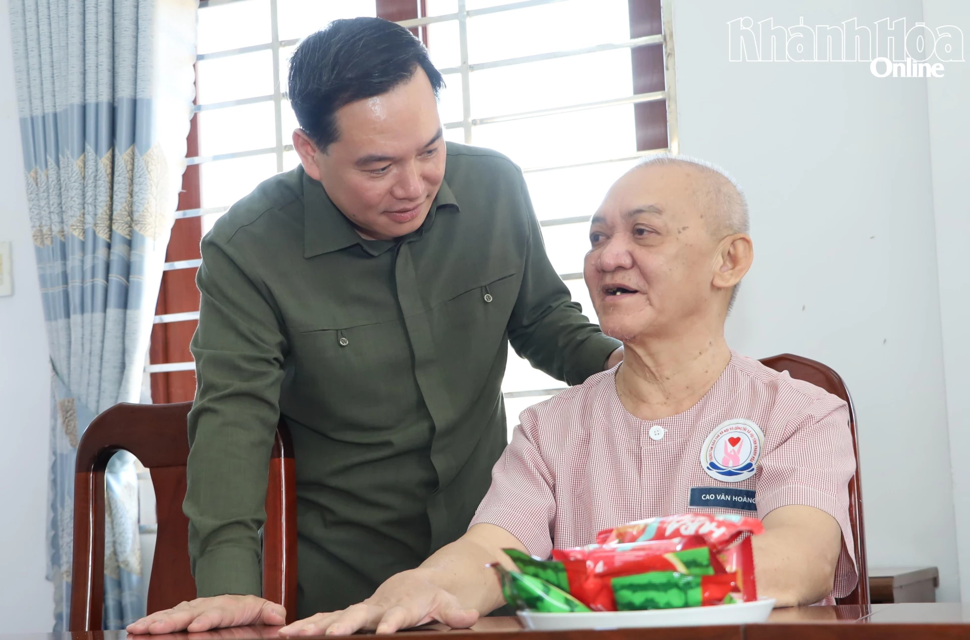 Đồng chí Hồ Xuân Trường ân cần thăm hỏi người cao tuổi đang được chăm sóc, nuôi dưỡng tại cơ sở 2 Trung tâm Bảo trợ xã hội và Công tác xã hội tỉnh.