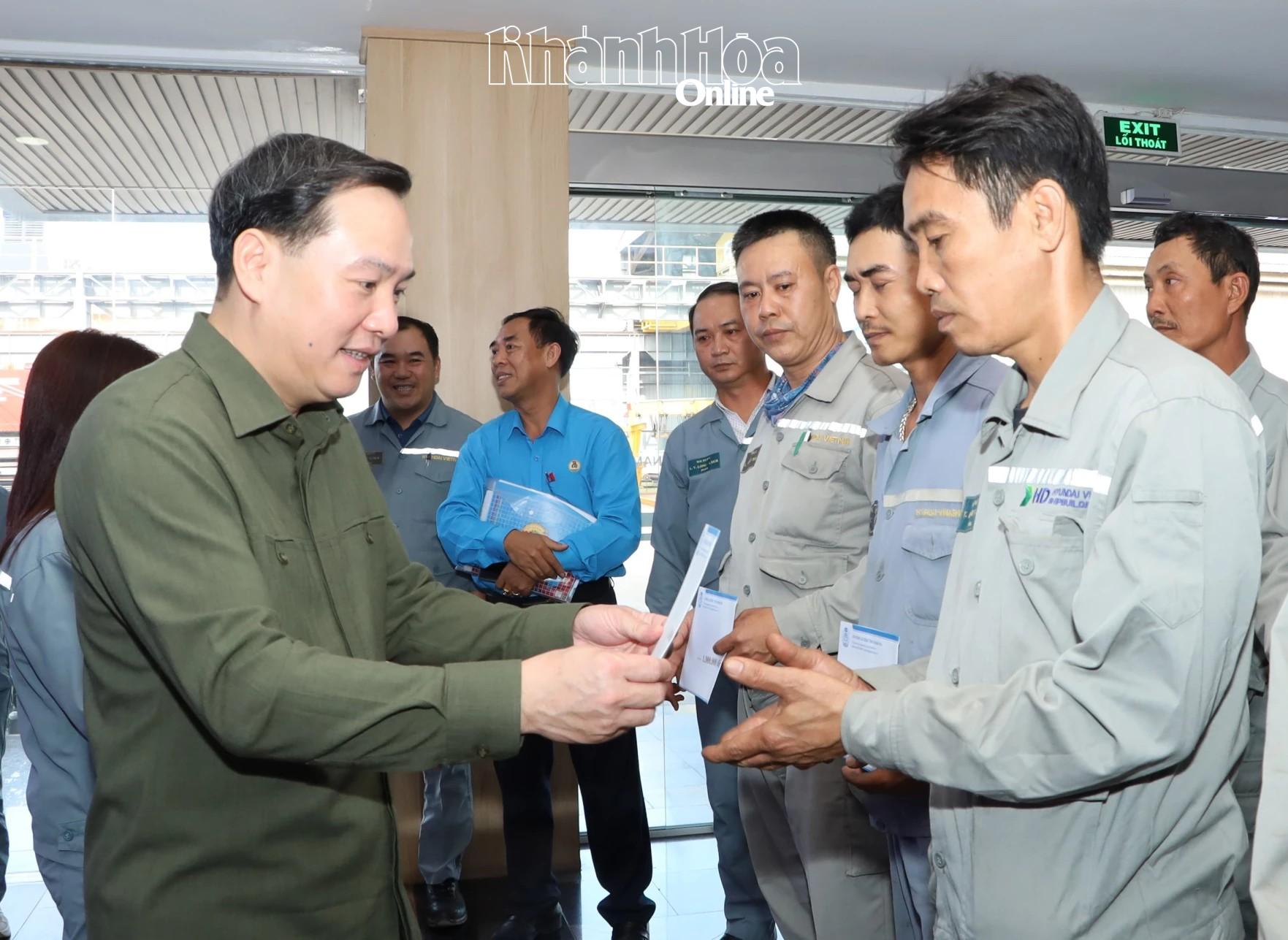Đồng chí Hồ Xuân Trường cùng lãnh đạo Liên đoàn Lao động tỉnh trao quà cho công nhân Công ty TNHH Đóng tàu HD Hyundai Việt Nam.