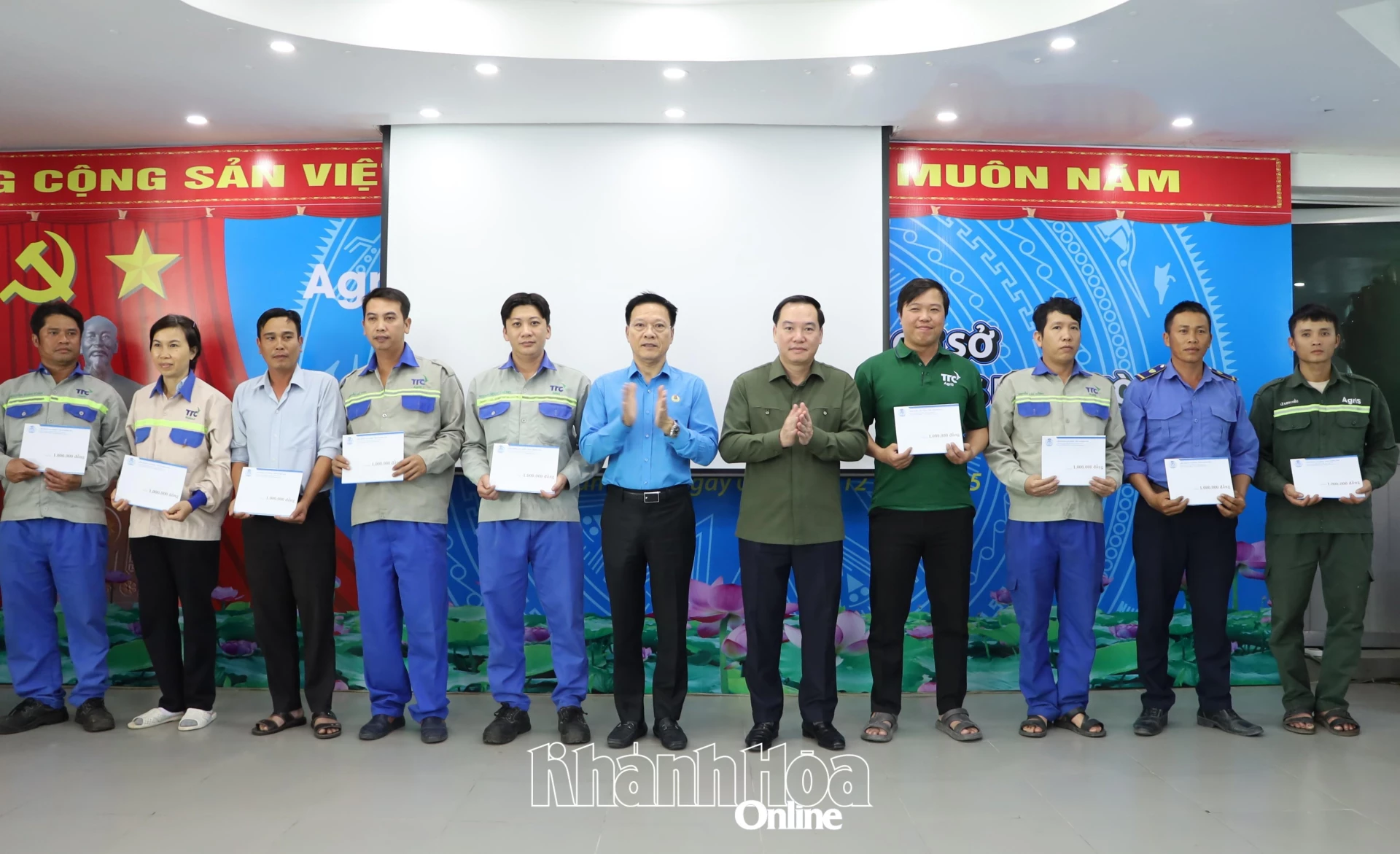 Đồng chí Hồ Xuân Trường và lãnh đạo Liên đoàn Lao động tỉnh trao quà Tết cho công nhân Công ty Cổ phần Xuất nhập khẩu AGRIS Ninh Hòa.