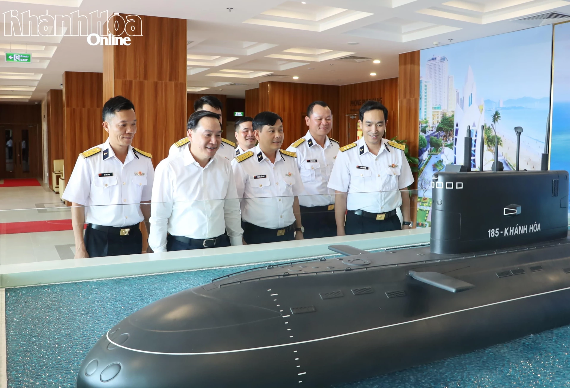 Đồng chí Hồ Xuân Trường và lãnh đạo Lữ đoàn Tàu ngầm 189 Hải quân tham quan mô hình tàu ngầm tại trụ sở Tỉnh ủy.