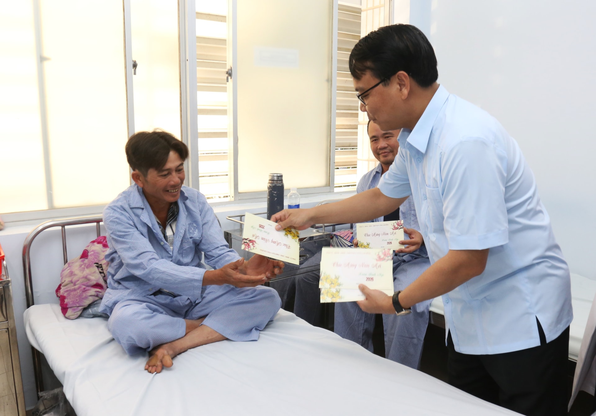 Đối với những trường hợp có hoàn cảnh khó khăn phải ở lại bệnh viện trong thời khắc chuyển giao năm mới, đồng chí đã trao quà Tết, gửi lời chúc năm mới an khang, mong mỗi người bệnh luôn giữ vững tinh thần lạc quan, tin tưởng vào sự chăm sóc của đội ngũ thầy thuốc.
