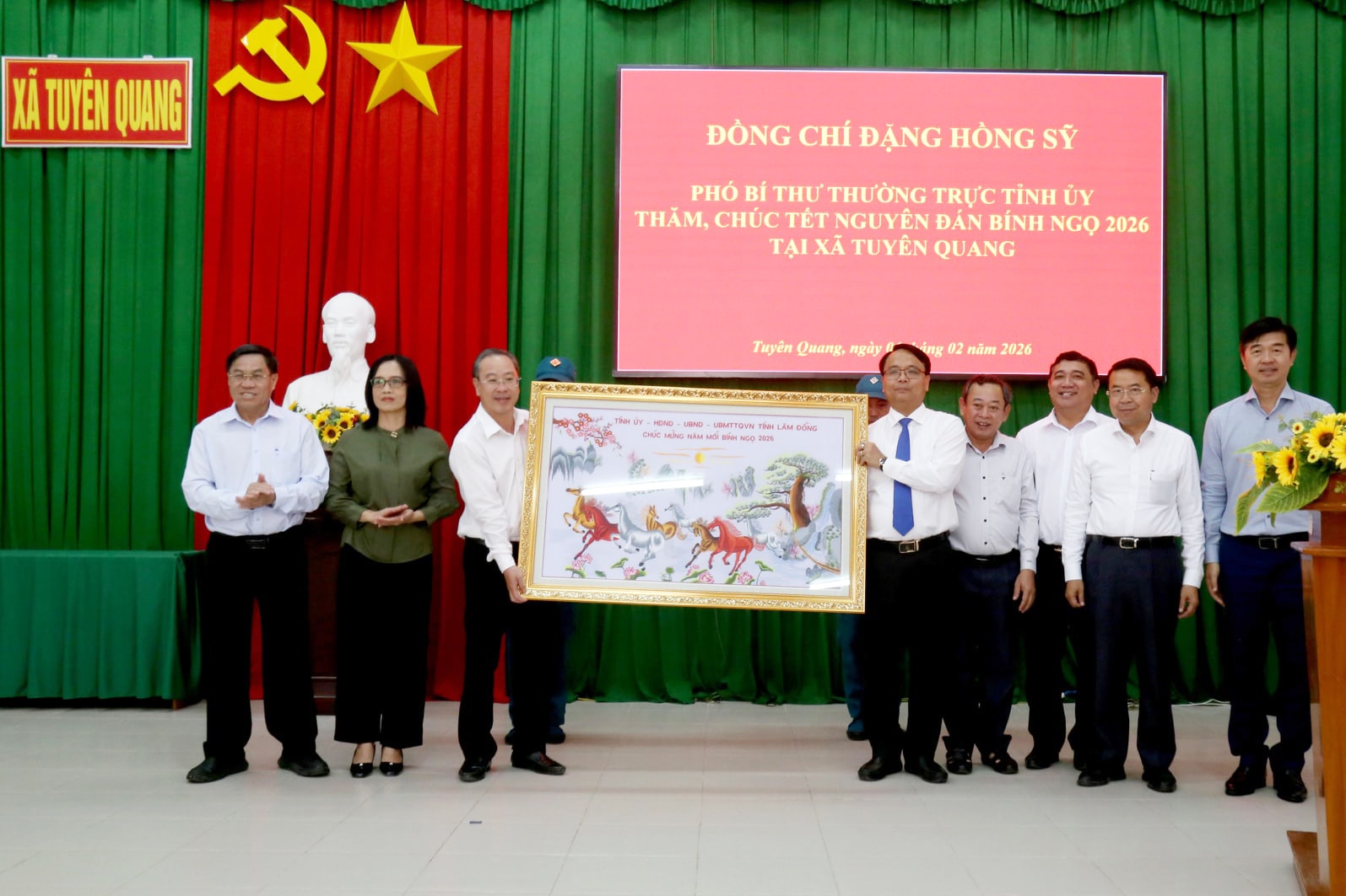 Tại buổi thăm, đồng chí Đặng Hồng Sỹ thông tin về kết quả Đại hội XIV của Đảng và tình hình kinh tế - xã hội tỉnh Lâm Đồng năm 2025. Sau khi hợp nhất 3 tỉnh, bộ máy chính quyền sớm ổn định và đạt kết quả tích cực: tổng thu ngân sách gần 31.500 tỷ đồng, vượt dự toán Trung ương; đóng góp 1,66% vào tăng trưởng kinh tế quốc gia.