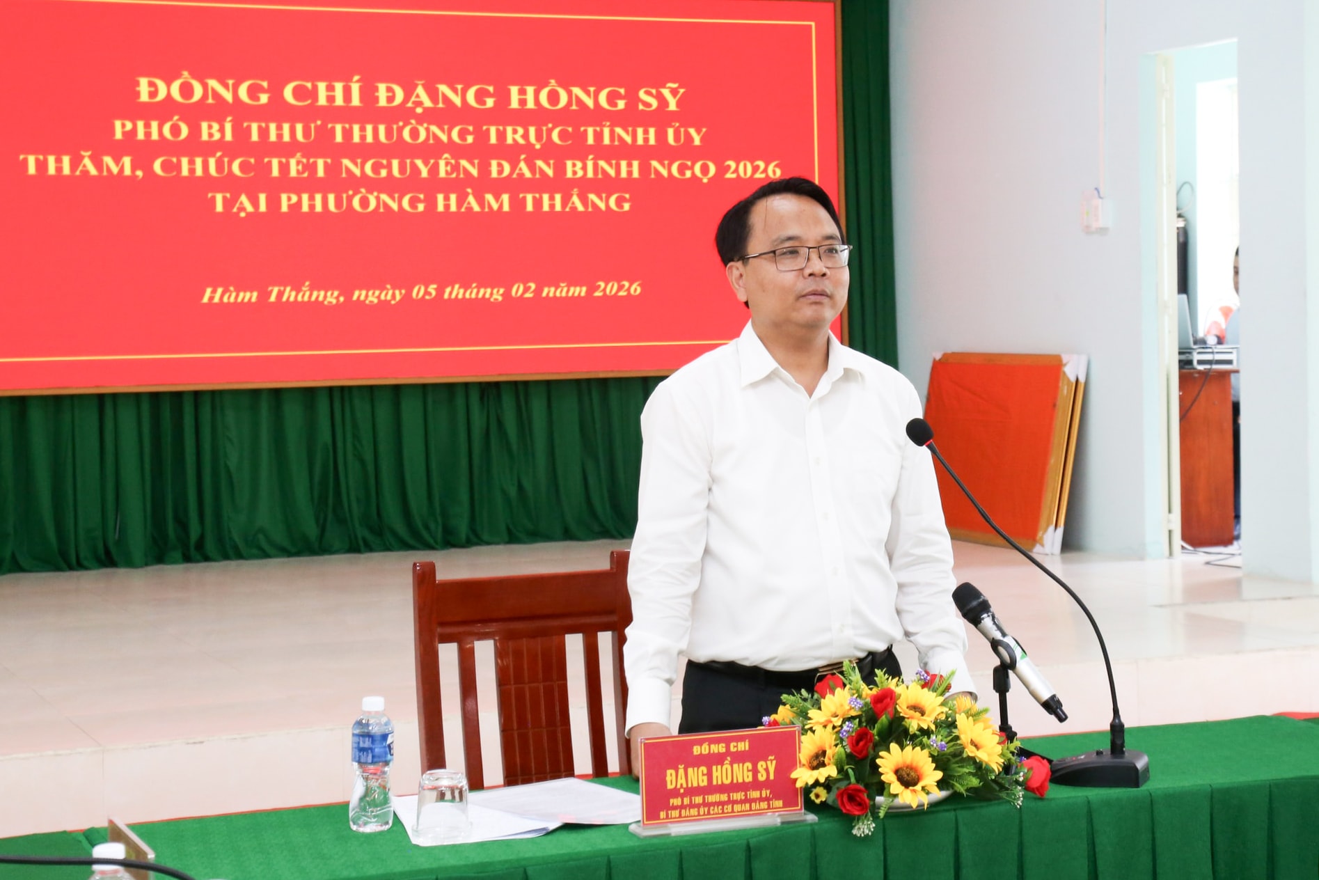 Đồng chí Đặng Hồng Sỹ, Phó Bí thư Thường trực Tỉnh ủy Lâm Đồng phát biểu tại buổi thăm, chúc tết tại phường Hàm Thắng