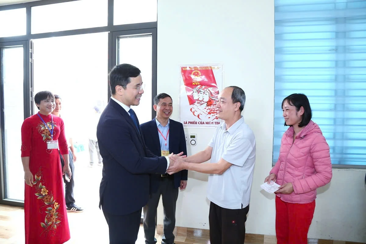 Đồng chí Nguyễn Hồng Phong, Ủy viên dự khuyết Trung ương Đảng, Phó Bí thư Thường trực Tỉnh ủy, Phó Trưởng Ban Thường trực Ban Chỉ đạo Bầu cử tỉnh thăm hỏi, trò chuyện với cử tri.