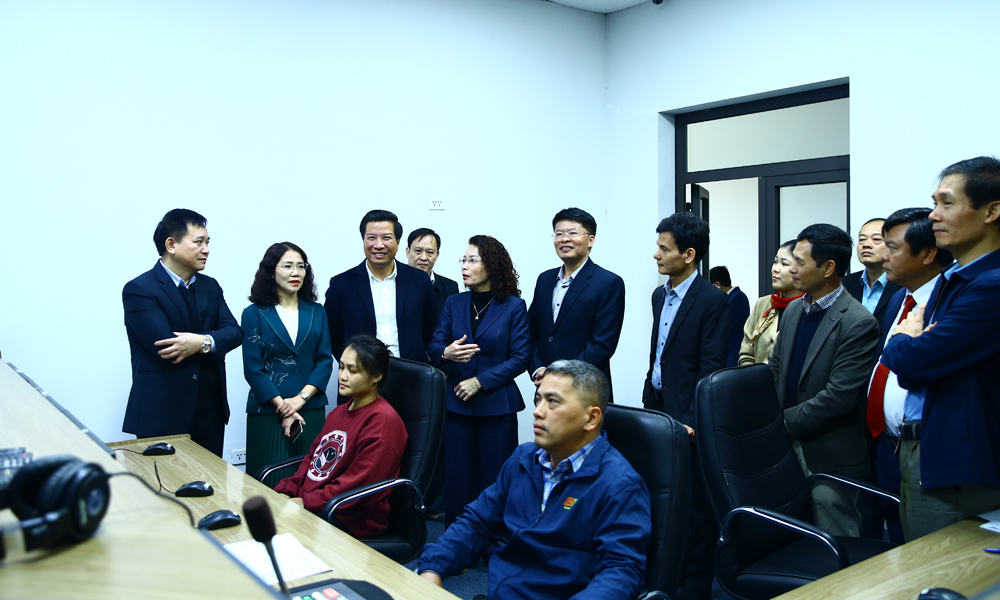 Đồng chí Nguyễn Thị Hương thăm trường quay của Báo và Phát thanh, Truyền hình Bắc Ninh.