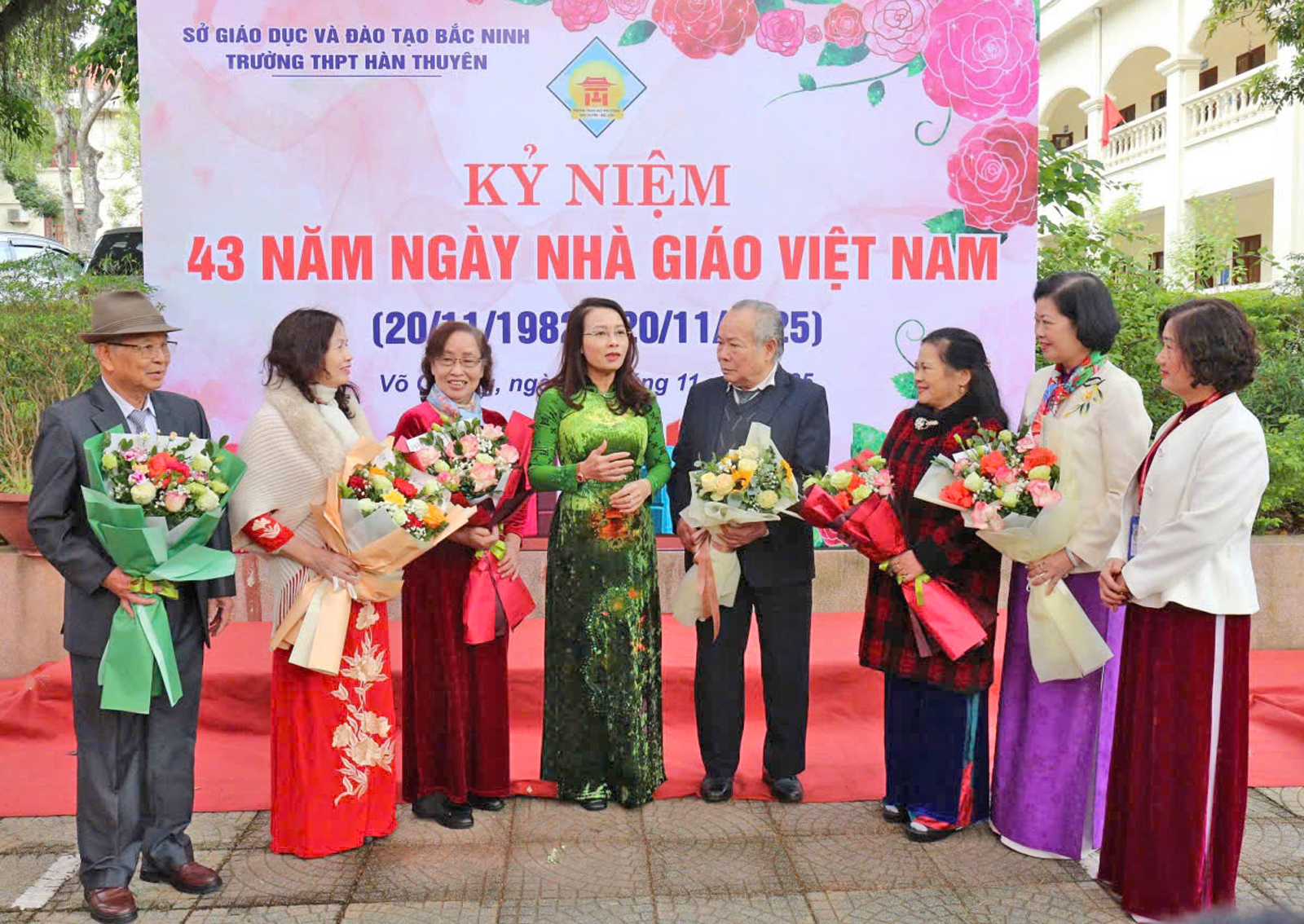 Đồng chí Nguyễn Thị Hương, Phó Bí thư Thường trực Tỉnh ủy trò chuyện với các thế hệ nhà giáo nhân Ngày Nhà giáo Việt Nam (20- 11).