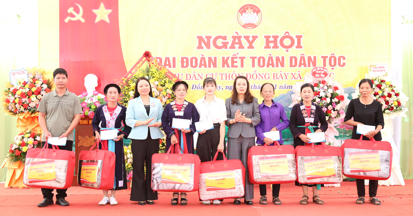 Đồng chí Nguyễn Thị Hương, Phó Bí thư Thường trực Tỉnh ủy tặng quà hộ khó khăn tại thôn Đồng Bây, xã An Lạc. Ảnh Quốc Phương