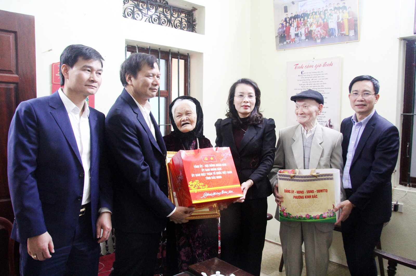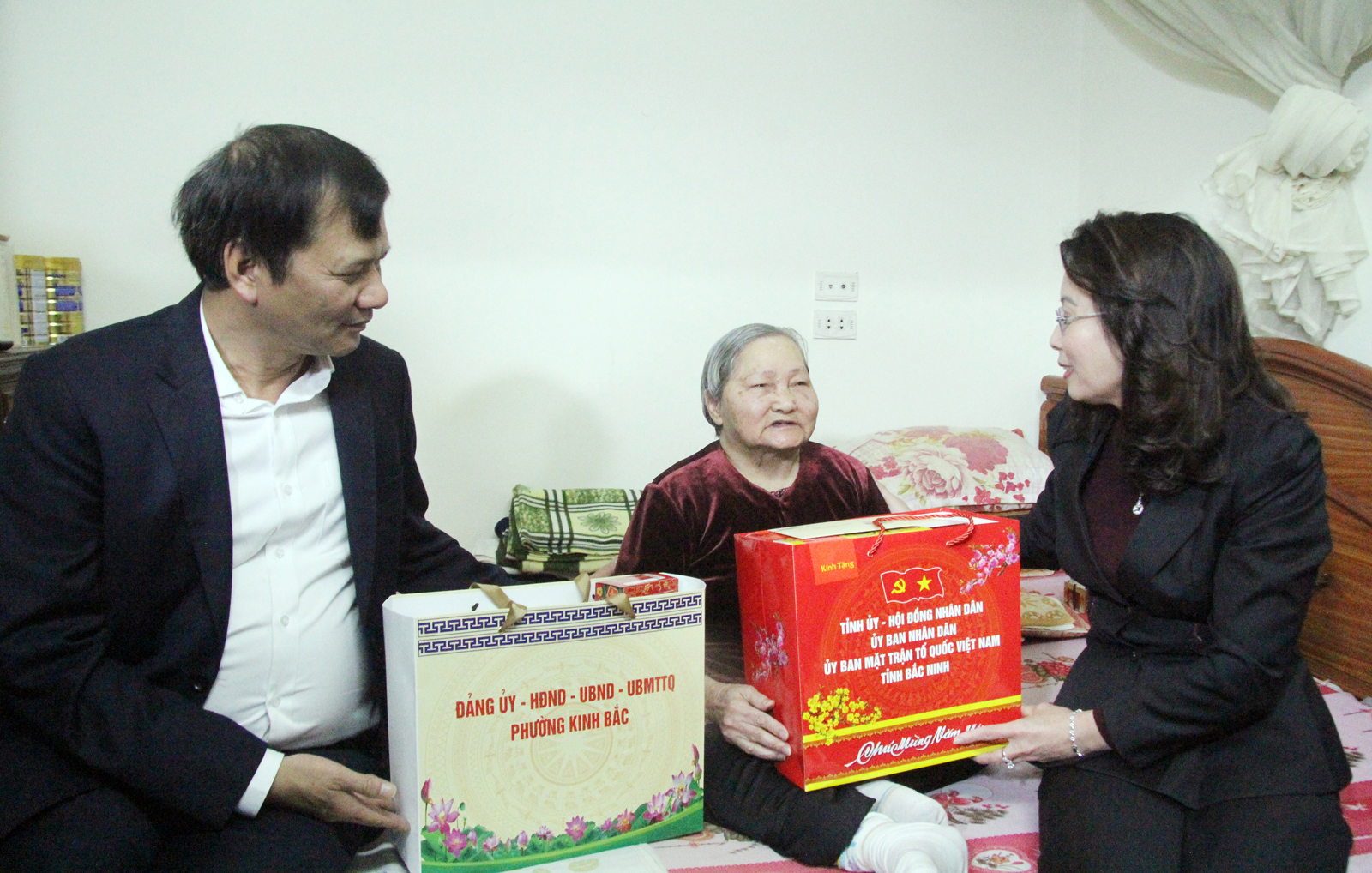 Các đồng chí: Nguyễn Thị Hương, Phó Bí thư Thường trực Tỉnh ủy; Tạ Đăng Đoan, Bí thư Đảng ủy phường Kinh Bắc tặng quà Tết bà Nguyễn Thị Thanh ở khu Niềm Xá (phường Kinh Bắc).