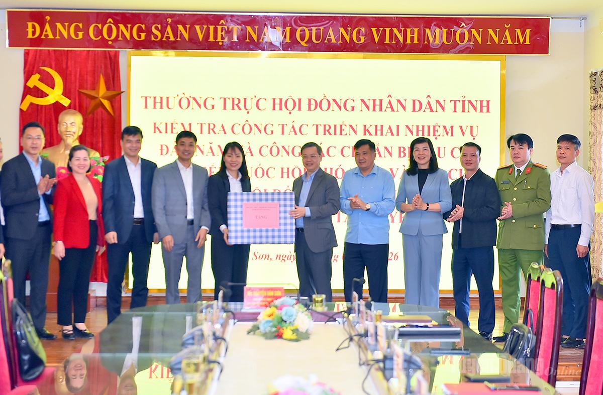 Trước buổi làm việc, đoàn đã kiểm tra thực tế công tác tuyên truyền, khánh tiết, niêm yết danh sách cử tri, chuẩn bị địa điểm bầu cử tại thôn Bình Ca 1 và xã Yên Sơn.
