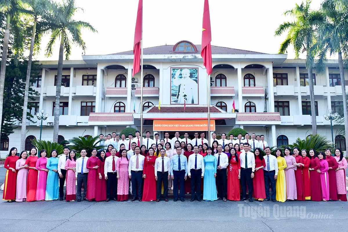 Đồng chí Ma Thế Hồng, Phó Bí thư Tỉnh ủy, Chủ tịch Ủy ban MTTQ tỉnh chụp ảnh lưu niệm cùng tập thể cán bộ, công chức, người lao động Văn phòng Tỉnh ủy.