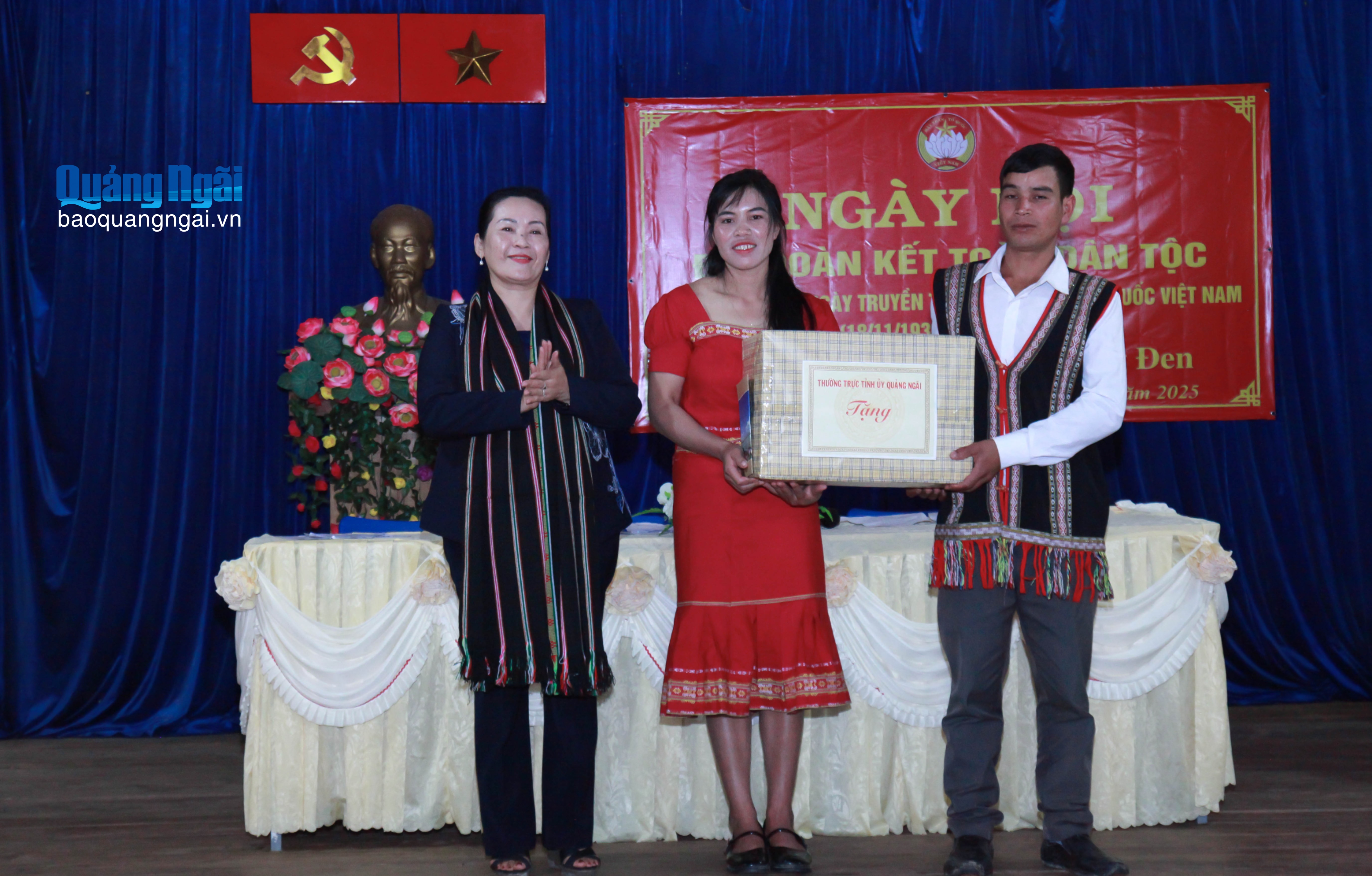 Phó Bí thư Tỉnh ủy Đinh Thị Hồng Minh tặng quà của Thường trực Tỉnh ủy cho thôn Rô Xia.