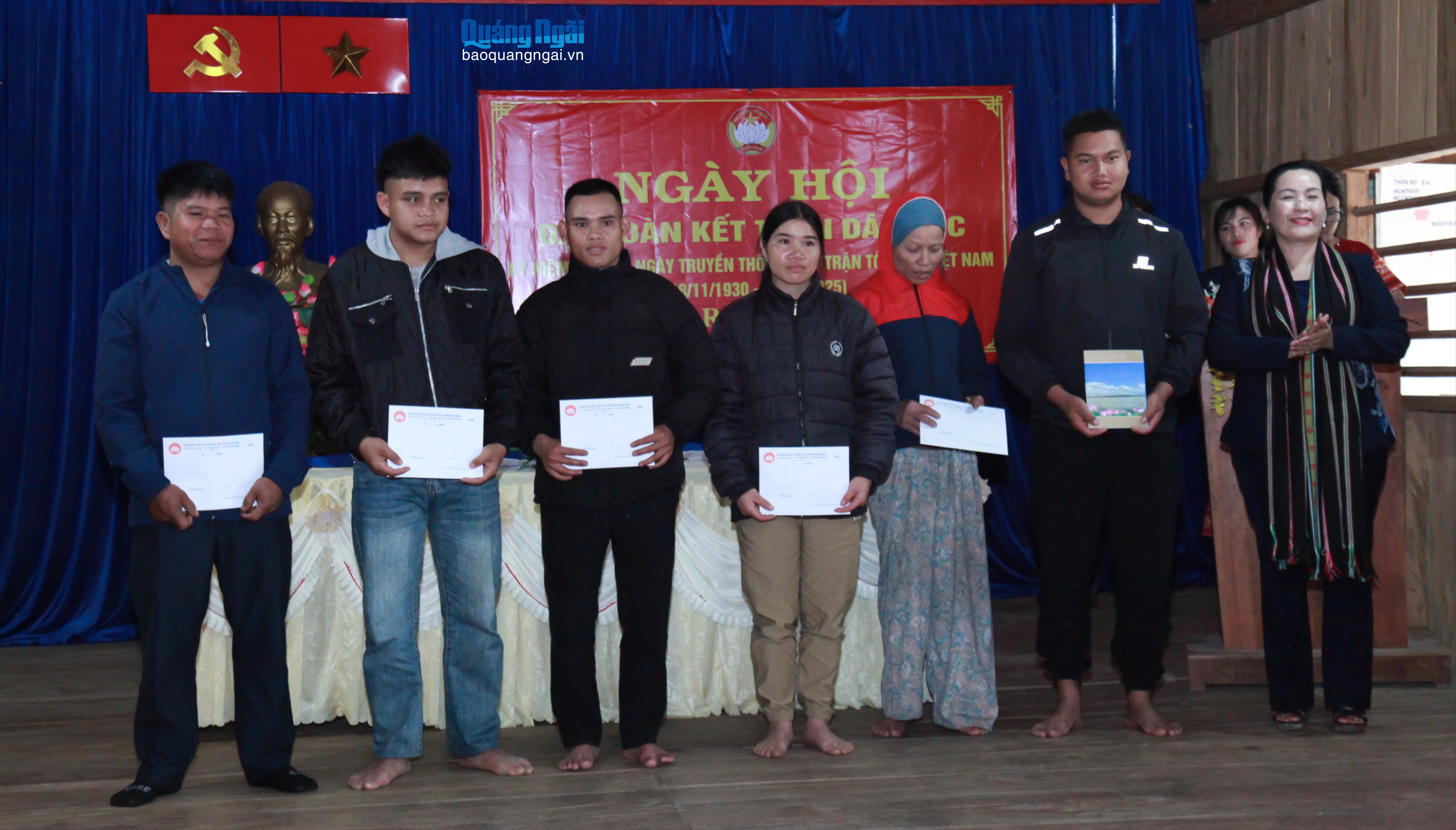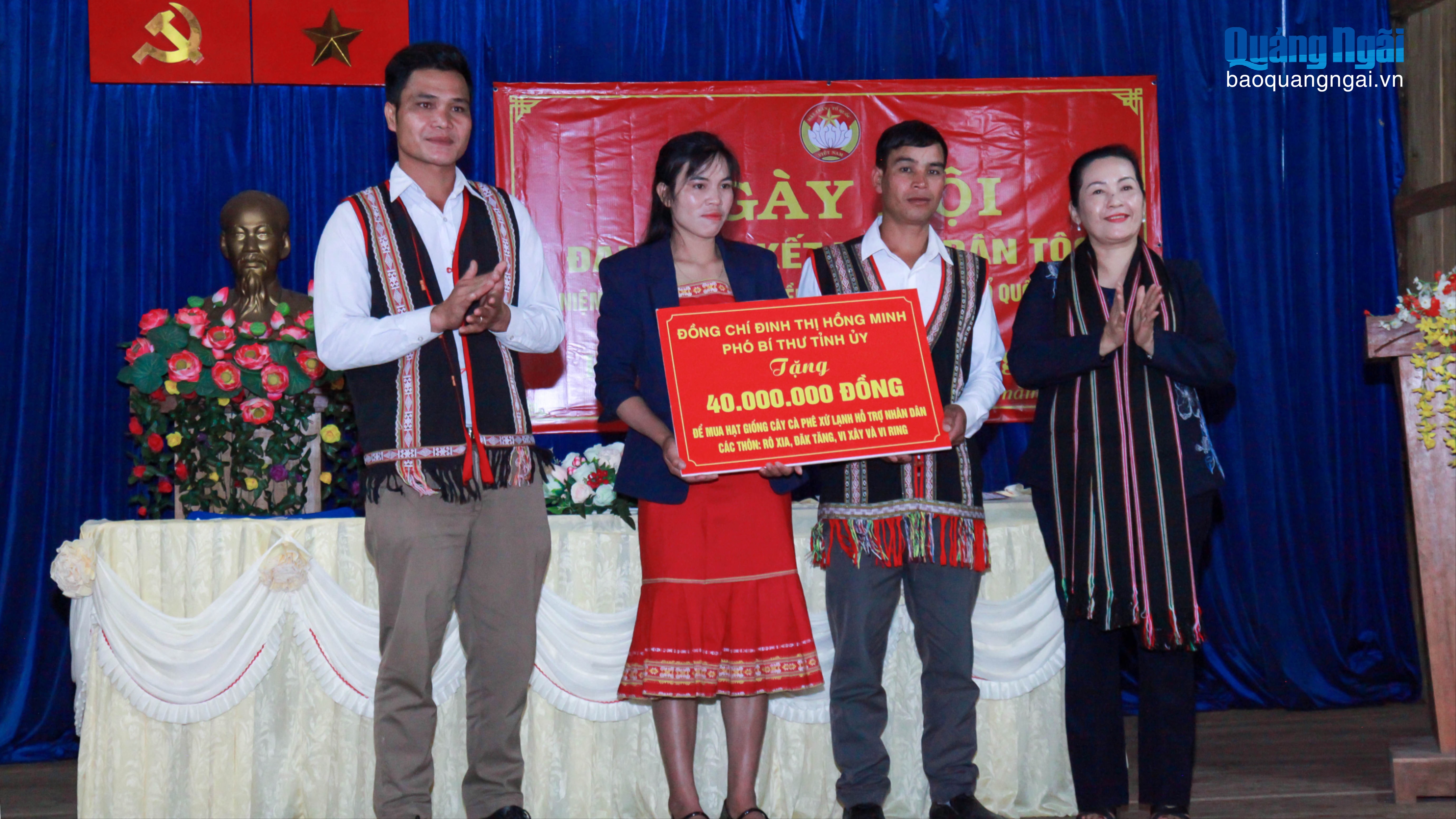 Phó Bí thư Tỉnh ủy Đinh Thị Hồng Minh trao hỗ trợ 40 triệu đồng để thôn Rô Xia và các thôn Vi Xây, Vi Ring, Đăk Tăng mua hạt giống cà phê xứ lạnh để gieo trồng, góp phần phát triển sinh kế cho người dân.