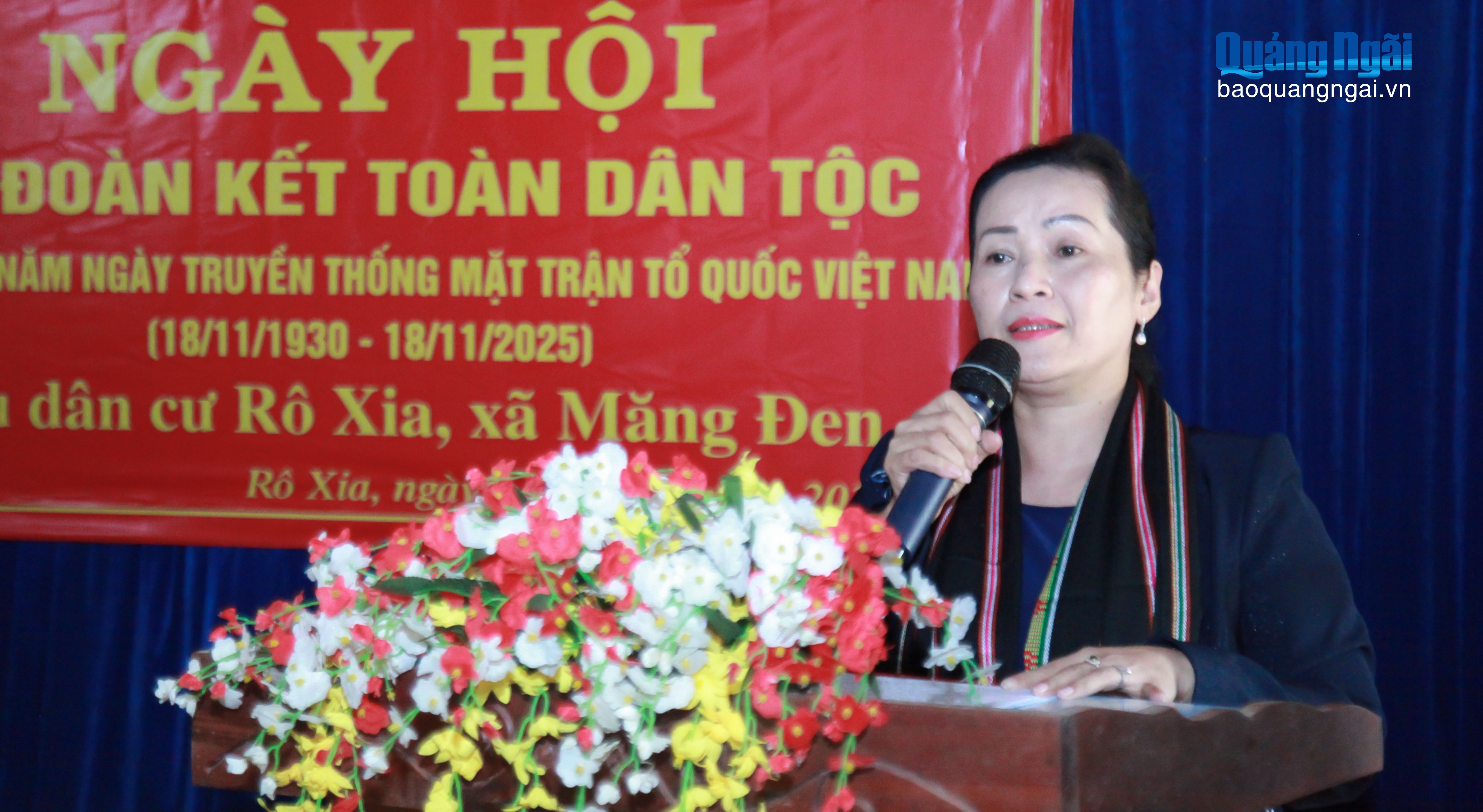 Phát biểu tại ngày hội, Phó Bí thư Tỉnh ủy Đinh Thị Hồng Minh ghi nhận, biểu dương những kết quả đạt được, tinh thần đoàn kết, ý chí vươn lên của nhân dân thôn Rô Xia. Đồng chí đề nghị Ban công tác Mặt trận và chính quyền địa phương tiếp tục định hướng người dân phát triển kinh tế phù hợp với điều kiện của địa phương; ứng dụng khoa học kỹ thuật, gắn sản xuất với chuỗi liên kết.