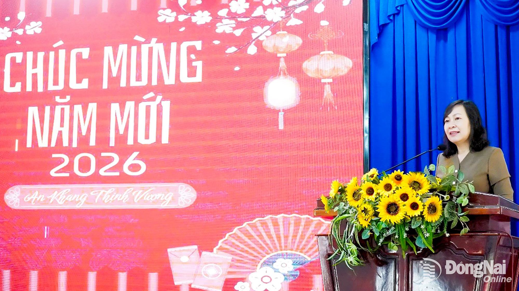 Phó Bí thư Tỉnh ủy, Chủ tịch Ủy ban MTTQ Việt Nam tỉnh Đồng Nai Huỳnh Thị Hằng chúc Tết người dân tại chương trình. Ảnh: Văn Tâm