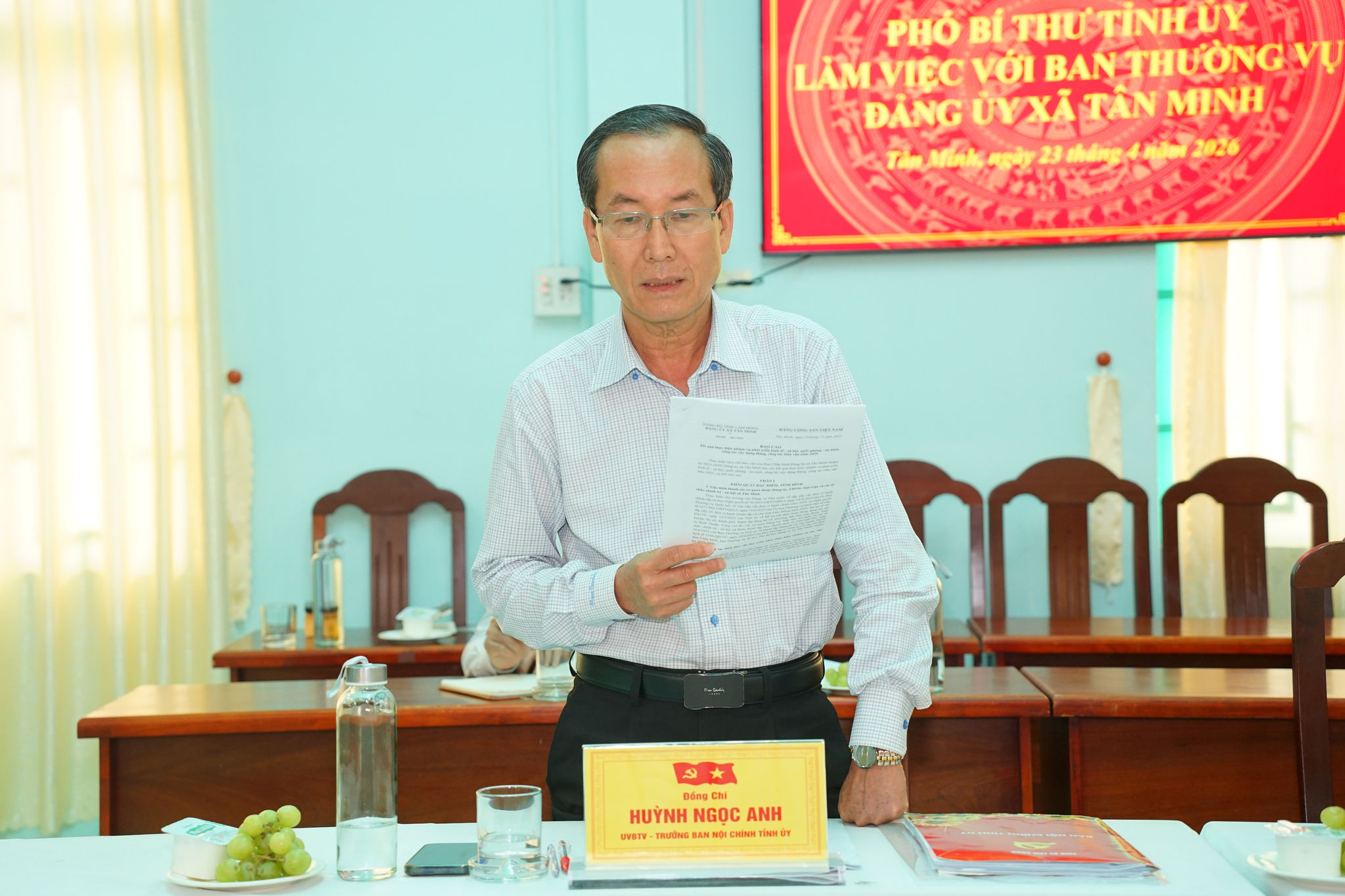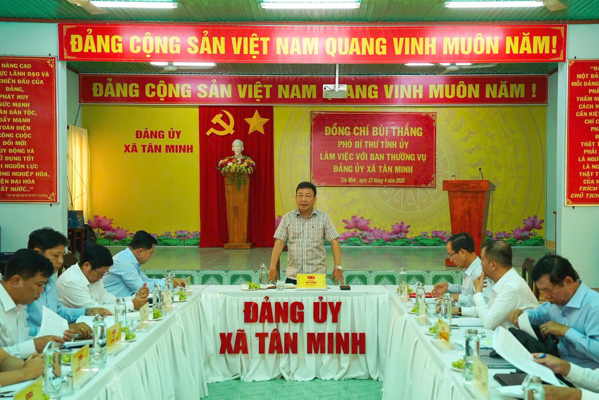 Tại buổi làm việc, Bí thư Đảng ủy xã Tân Minh Hà Lê Thanh Chung đã báo cáo tình hình kinh tế - xã hội trên địa bàn trong quý I/2026. Theo đó, xã Tân Minh có nhiều khởi sắc trong thu ngân sách 3 tháng đầu năm, vượt dự toán năm 2026.