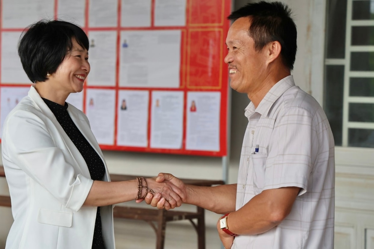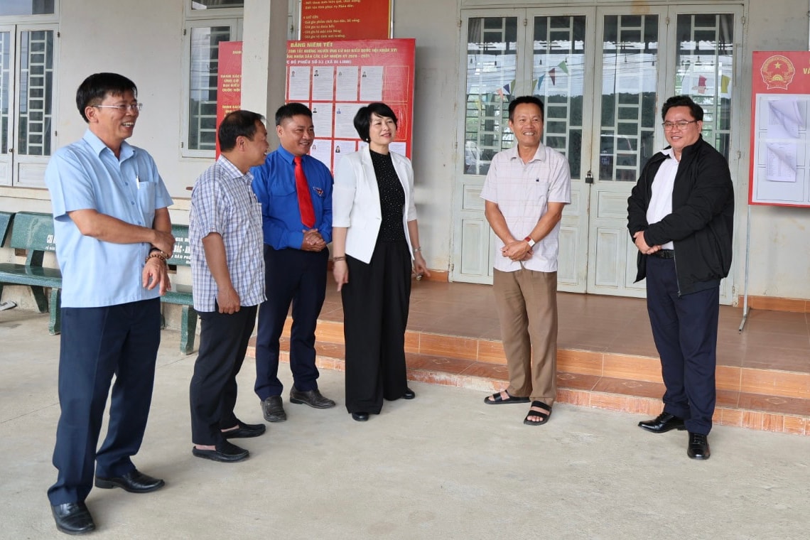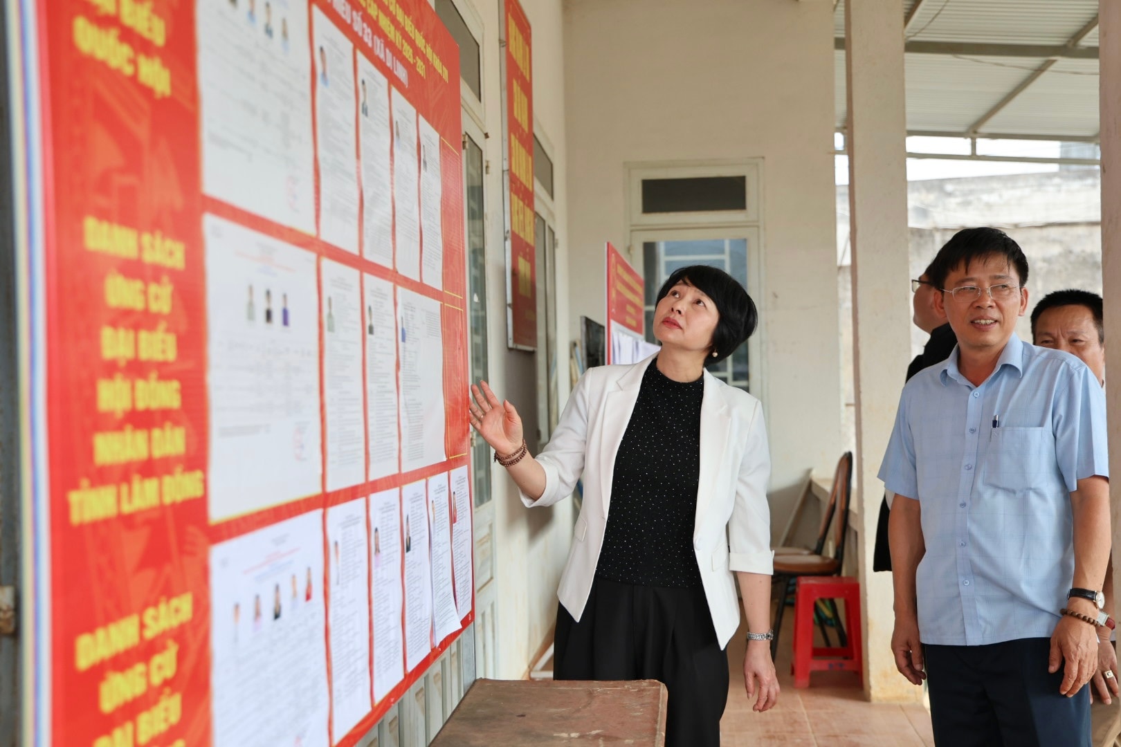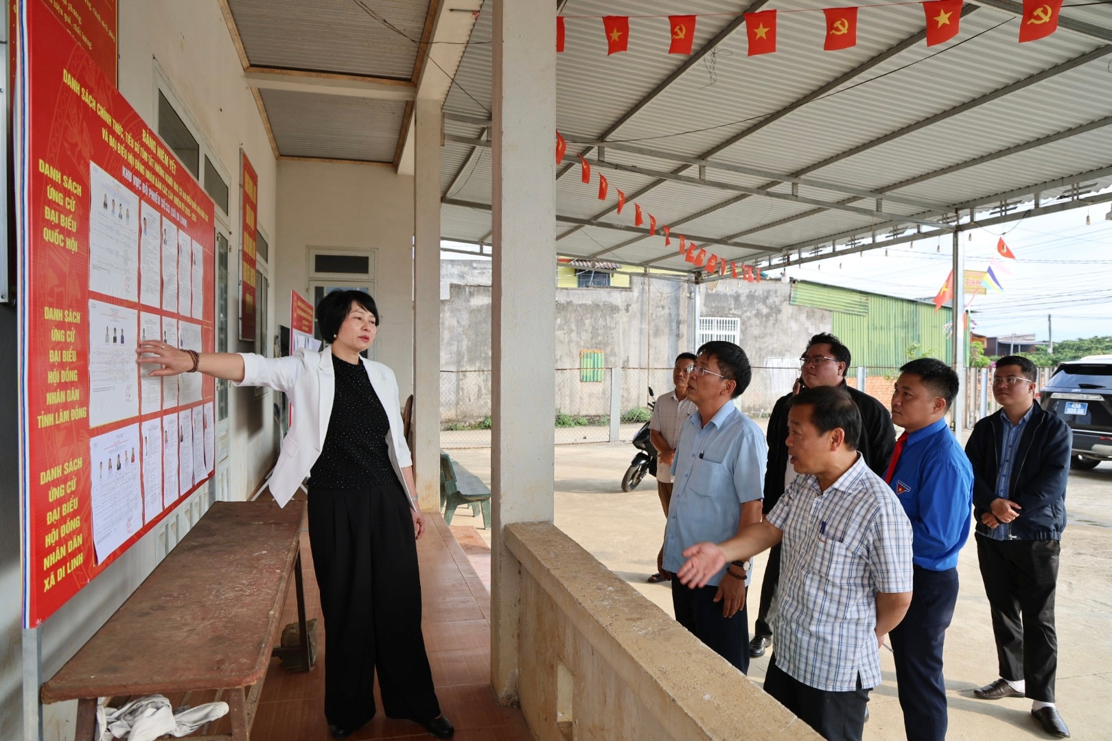 Đồng chí Phạm Thị Phúc, Phó Bí thư Tỉnh ủy Lâm Đồng kiểm tra công tác chuẩn bị bầu cử tại một khu vực bỏ phiếu trên địa bàn xã Di Linh