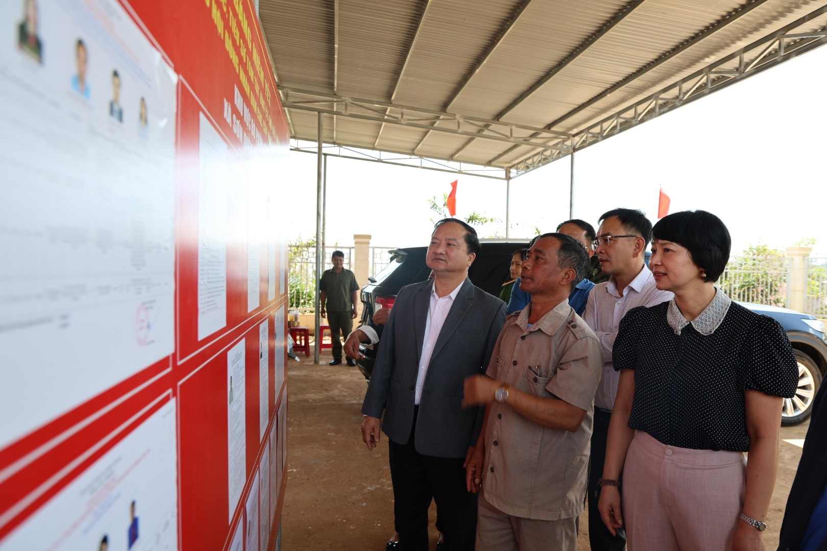 Đồng chí Phạm Thị Phúc kiểm tra việc niêm yết danh sách cử tri và tiểu sử tóm tắt của các ứng cử viên tại khu vực bỏ phiếu