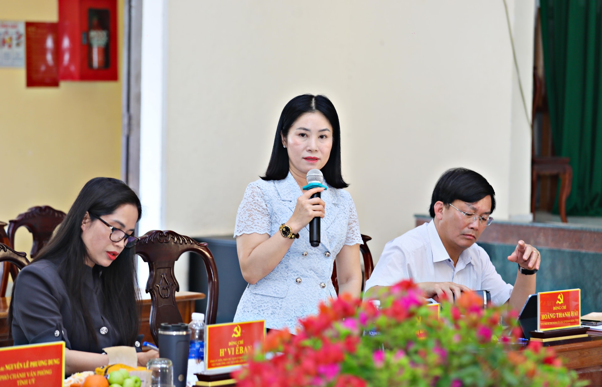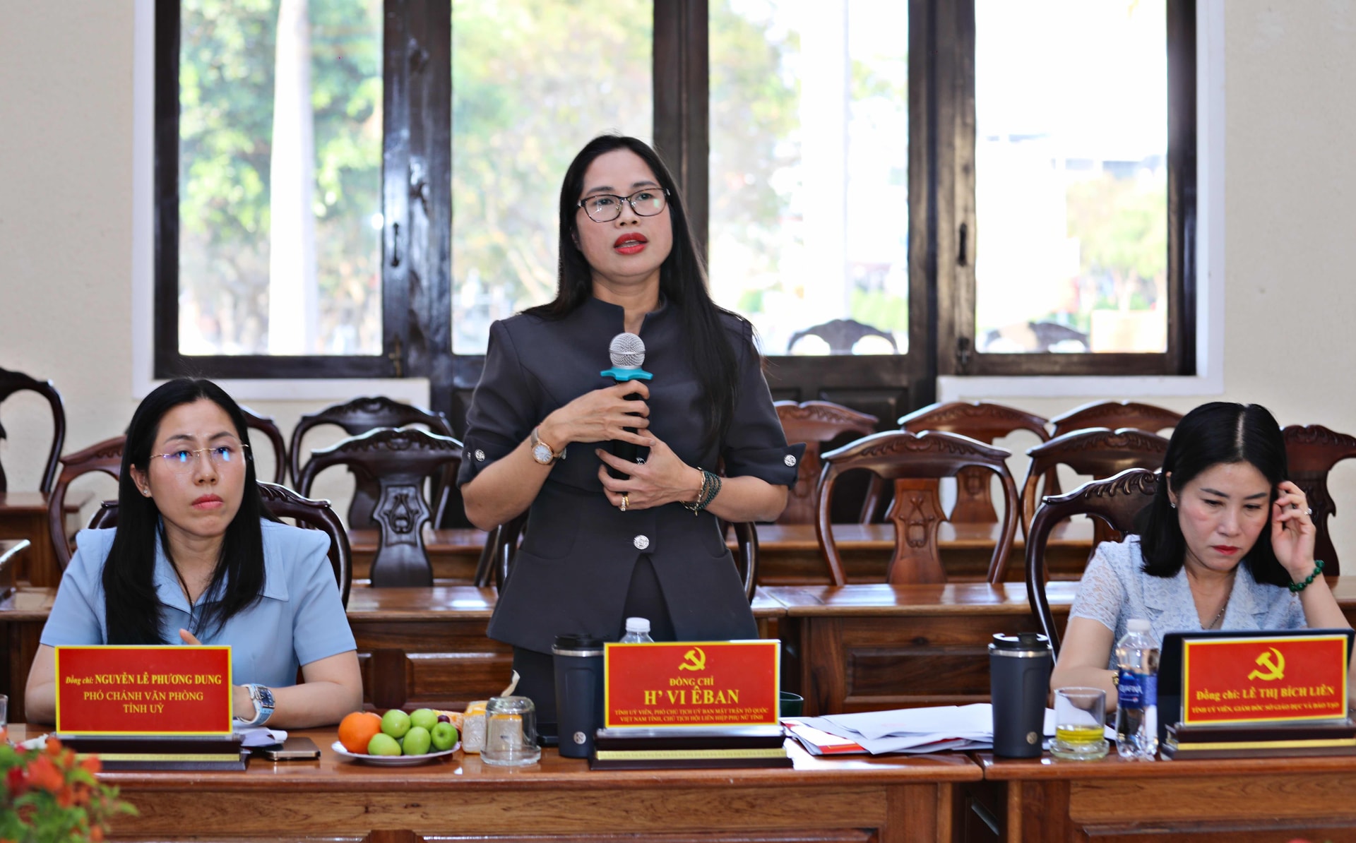 Đồng chí H' Vi Êban, Tỉnh ủy viên, Phó Chủ tịch Ủy ban MTTQ Việt Nam tỉnh, Chủ tịch Hội LHPN tỉnh phát biểu, giải đáp các kiến nghị của các địa phương