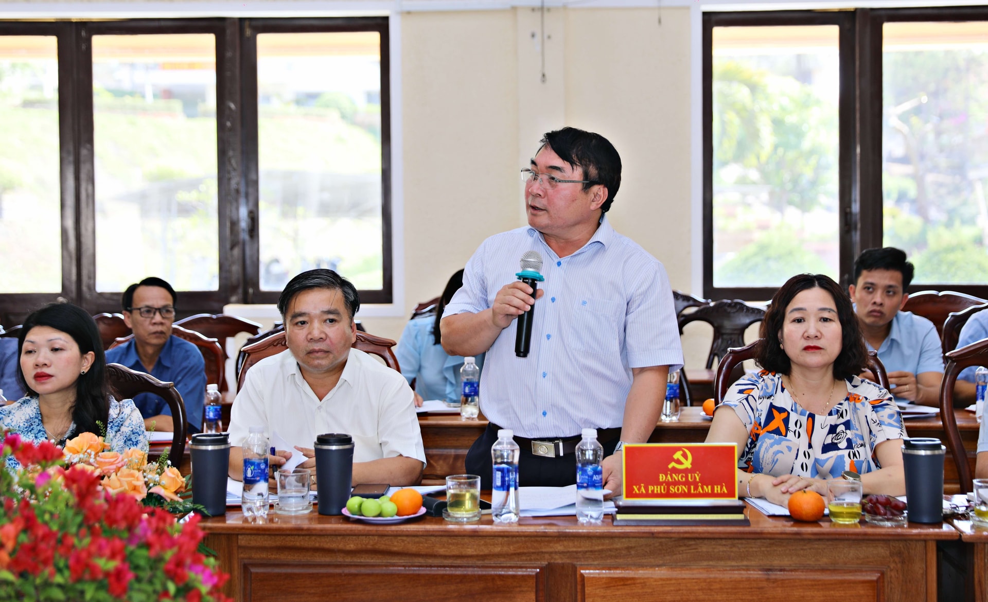 Đồng chí Hoàng Sơn, Bí thư Đảng ủy xã Phú Sơn Lâm Hà báo cáo kết quả tình hình triển khai nhiệm vụ chính trị tại địa phương