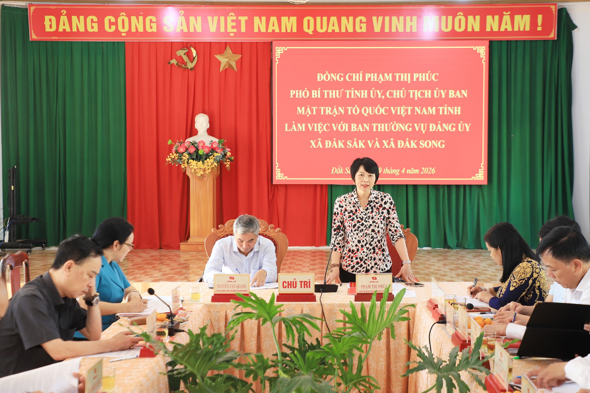 Đồng chí Phạm Thị Phúc cũng nhấn mạnh, xã Đắk Sắk và Đắk Song cần sớm hoàn thiện quy hoạch làm cơ sở thu hút đầu tư; đẩy mạnh các phong trào thi đua gắn với chuyển đổi số; quan tâm tạo nguồn, phát triển đảng viên; chủ động nắm bắt dư luận, kịp thời giải quyết các vấn đề Nhân dân quan tâm.