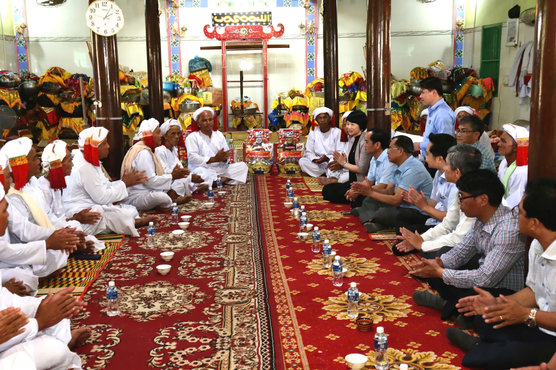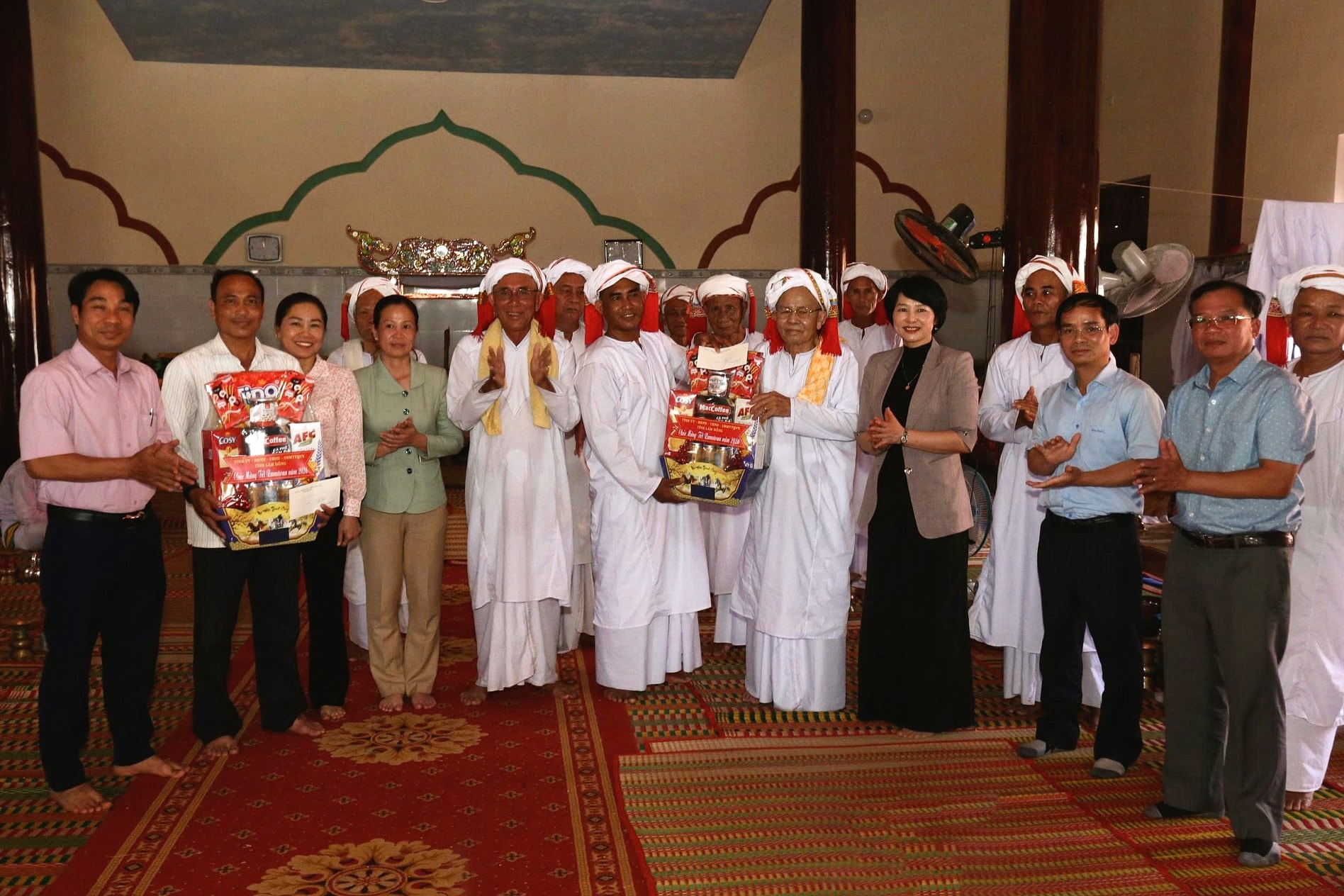 Nhân dịp này, Đoàn công tác đã trao tặng nhiều phần quà ý nghĩa, thể hiện sự quan tâm của lãnh đạo tỉnh đối với đồng bào Chăm Hồi giáo Bàni, góp phần để bà con đón Tết Ramưwan vui tươi, đầm ấm.