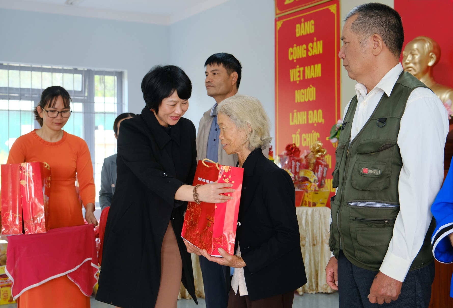 Đồng chí Phạm Thị Phúc trao tặng quà Tết cho các hộ gia đình tại xã Tân Hà Lâm Hà