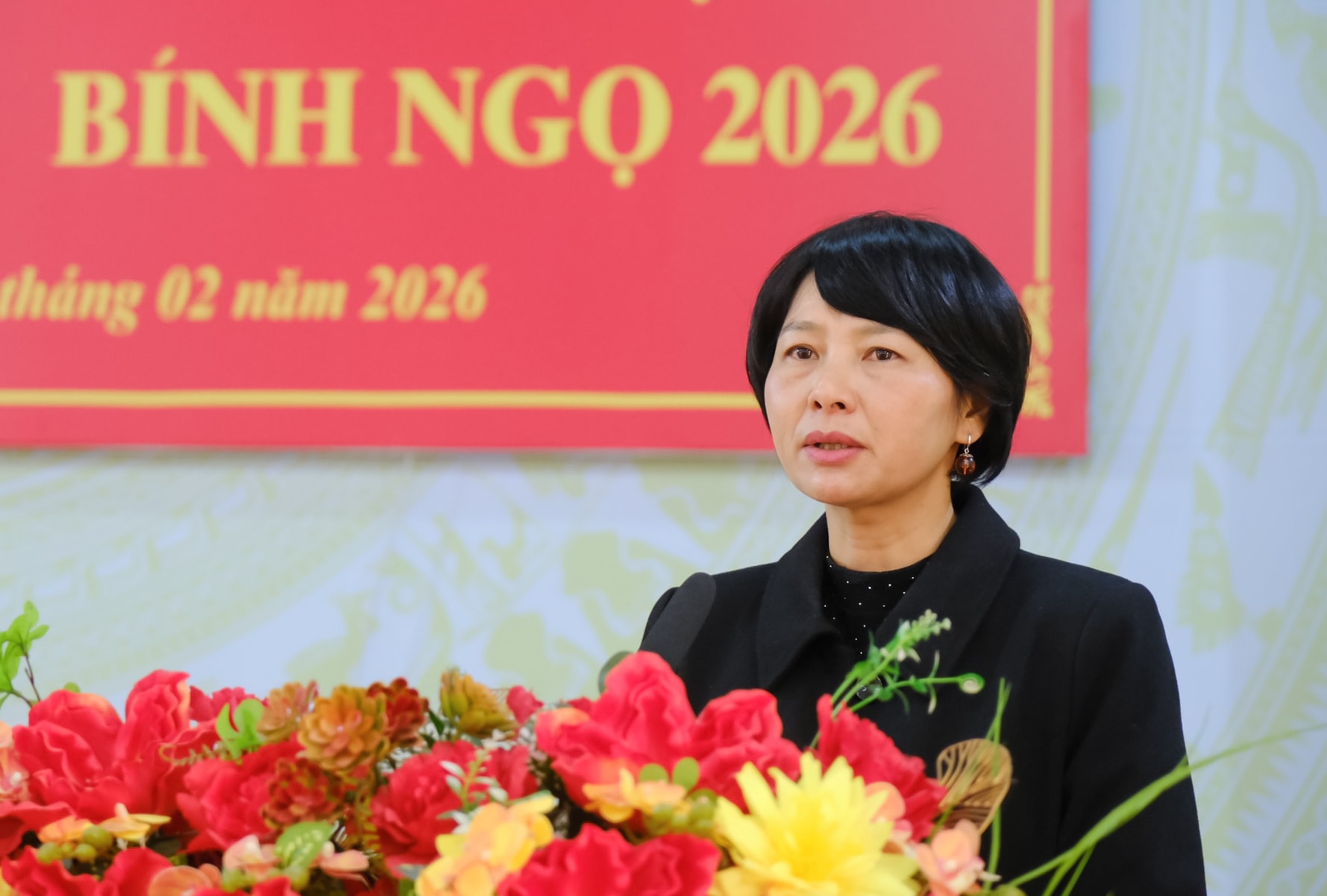 Đồng chí Phạm Thị Phúc, Phó Bí thư Tỉnh ủy, Chủ tịch Ủy ban MTTQ Việt Nam tỉnh Lâm Đồng phát biểu chúc Tết Đảng bộ, chính quyền và Nhân dân các địa phương
