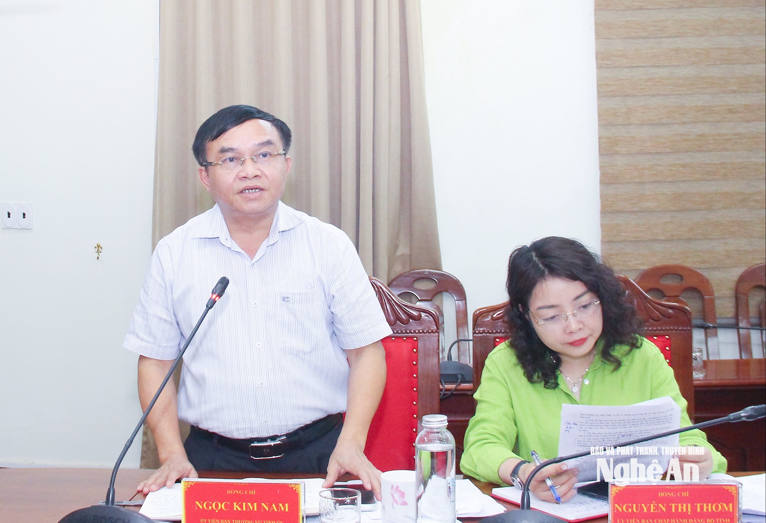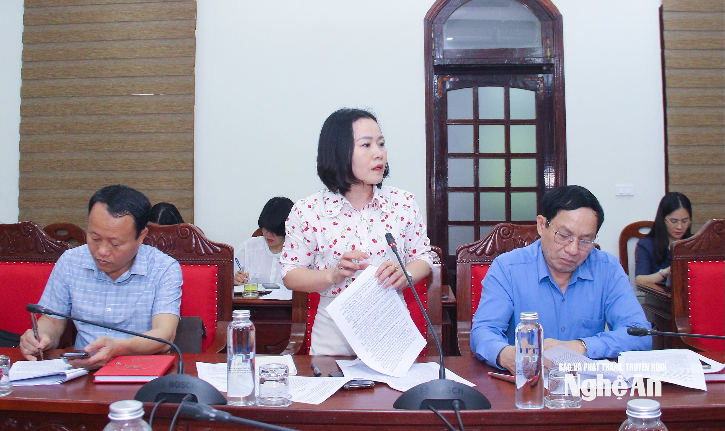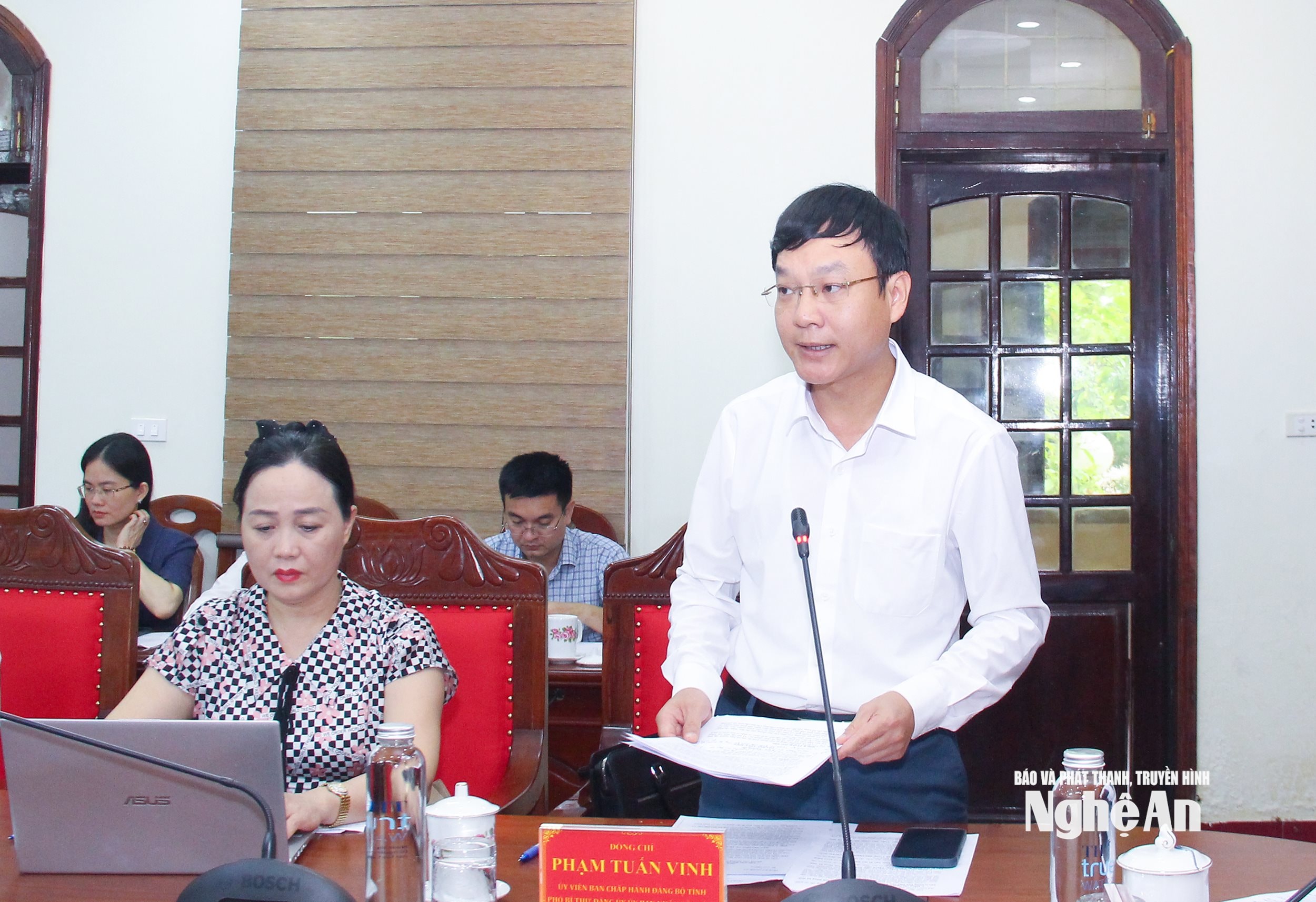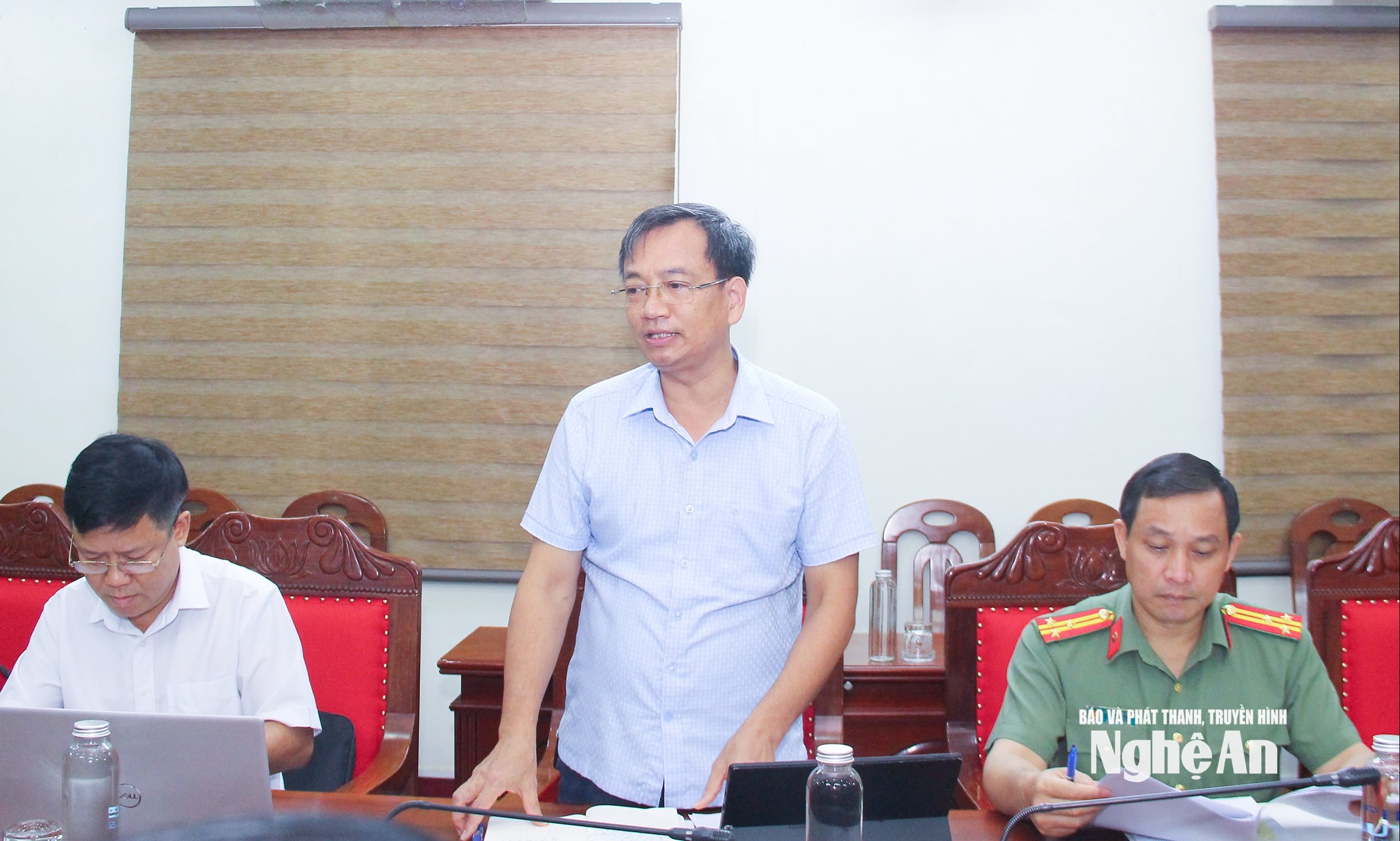 Đồng chí Trần Hữu Nghĩa - Phó Giám đốc Báo và phát thanh, truyền hình Nghệ An, thành viên Ban Chỉ đạo nêu ý kiến liên quan đến chủ động thông tin phục vụ công tác tuyên truyền trong thực hiện các chủ trương, nhất là các dự án đầu tư trọng điểm trên địa bàn tỉnh. Ảnh: Mai Hoa
